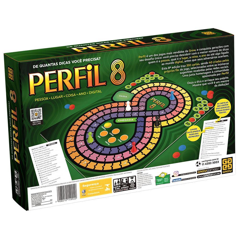 Se você gosta de desafios, interação e boas risadas, o Perfil 8 é o jogo perfeito para reunir a família e os amigos! Com uma proposta envolvente e dinâmica, ele testa seus conhecimentos, sua intuição e, claro, sua habilidade de adivinhar com poucas dicas. Afinal… de quantas dicas você precisa? Perfil é um dos jogos mais populares da Grow, e acaba de ganhar sua tão aguardada nova edição: o Perfil 8! O desafio continua o mesmo: adivinhar com o menor número possível de dicas quem é a pessoa, qual é o lugar, o ano, o objeto ou o elemento do mundo digital, antes que os outros jogadores descubram! A grande novidade desta versão é que, dentre 350 cartas, 40 delas foram criadas pelos fãs, escolhidas entre diversas sugestões enviadas nós. Como jogar Perfil? Os participantes recebem uma lista de pistas sobre uma pessoa, lugar, objeto, ano ou tema digital. A cada dica revelada, o desafio fica mais fácil — mas quanto menos dicas você usar para acertar a resposta, mais pontos você ganha! É uma competição leve, estratégica e extremamente divertida. Por que você vai amar ter o Perfil 8 em casa? Porque ele é aquele tipo de jogo que une todo mundo: jovens, adultos, famílias, casais e amigos. É ideal para festas, encontros de fim de semana, viagens, confraternizações ou até para animar um dia comum. Cada rodada é imprevisível, surpreendente e cheia de revelações — sempre rendendo boas histórias e muita diversão. Ótimo também para presentear! O Perfil 8 é uma excelente opção de presente criativo para quem ama jogos de raciocínio, quem gosta de curiosidades ou quem simplesmente adora se divertir de maneira saudável e inteligente. Garanta já o seu e descubra quem da sua turma realmente precisa de menos dicas para adivinhar tudo! Transforme suas reuniões em momentos especiais com o jogo que conquista qualquer mesa. Compre agora e tenha o jogo favorito das noites de diversão! Idade: A partir de 12 anos Participantes: 2 ou mais Tempo estimado de jogo: 45 minutos