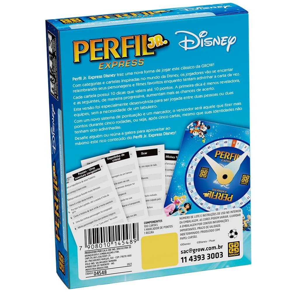 Perfil Jr. Express Disney traz uma nova forma de jogar este clássico da GROW! Com categorias e cartelas inspiradas no mundo da Disney, os jogadores vão se encantar relembrando seus personagens e filmes favoritos enquanto tentam adivinhar a carta da vez. Cada cartela possui 10 dicas que valem até 10 pontos. A primeira dica é menos reveladora, e as seguintes, de maneira progressiva, aumentam mais as chances e acerto. Esta versão foi especialmente desenvolvida para ser jogada entre duas pessoas ou duas equipes, sem a necessidade de um tabuleiro. Com um novo sistema de pontuação e um marcador, o vencedor será aquele que fizer mais pontos durante cinco rodadas, ou seja, após cinco cartas, mesmo que suas identidades não tenham sido adivinhadas. Desafie alguém ou reúna a galera para aproveitar ao máximo este rico conteúdo do Perfil Jr. Express Disney!