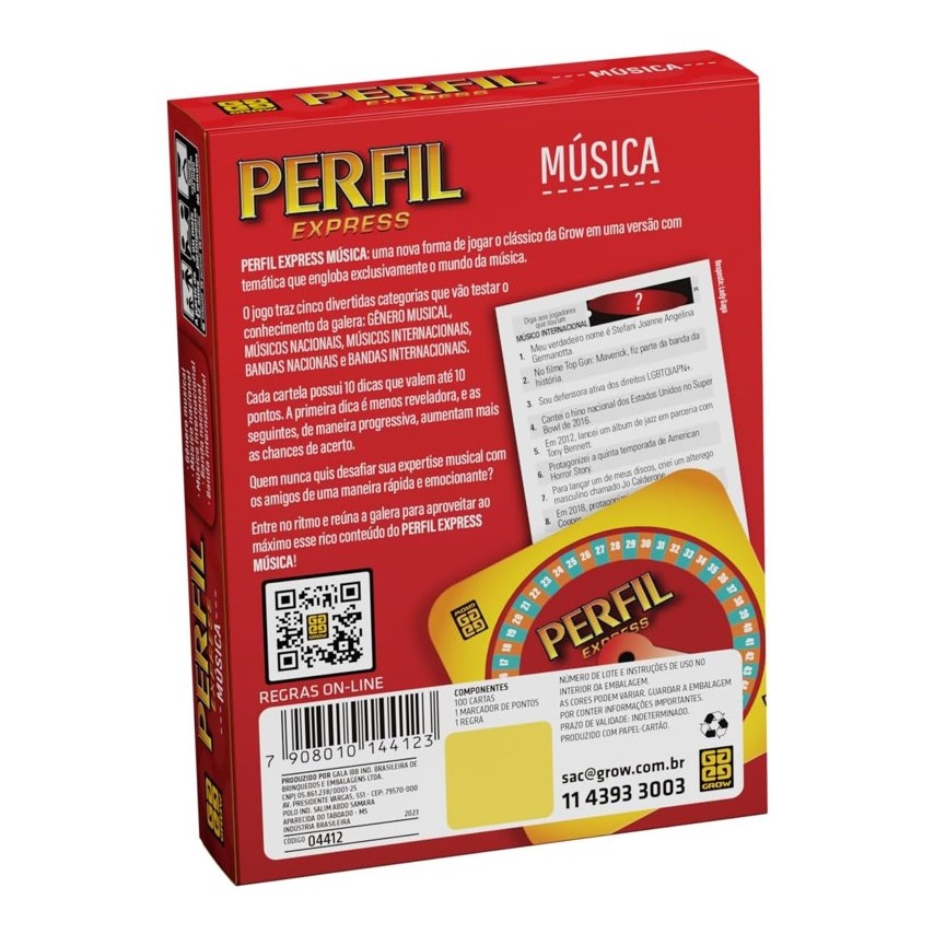 Perfil Express Música: uma nova forma de jogar este clássico da Grow em uma versão com temática que engloba exclusivamente o mundo da música. O jogo trás cinco divertidas categorias que vão testar o conhecimento da galera: GÊNERO MUSICAL, MÚSICOS NACIONAIS, MÚSICOS INTERNACIONAIS, BANDAS NACIONAIS E BANDAS INTERNACIONAIS. Cada cartela possui 10 dicas que valem até 10 pontos. A primeira dica é menos reveladora, e as seguintes, de maneira progressiva, aumentam mais as chances de acerto. Quem nunca quis desafiar sua expertise musical com os amigos de uma maneira rápida e emocionante? Entre no ritmo e reúna a galera para aproveitar ao máximo esse rico conteúdo do PERFIL EXPRESS MÚSICA Especificações Técnicas Faixa Etária : A partir de 12 anos Componentes : Contém 100 cartas, 1 marcador de pontos e 1 regra Dimensões da embalagem : 11,4 x 16 x 3,6 cm Participantes : 2 ou mais Garantia contra defeitos de fabricação (meses) : 3 Código de Barras : 7908010144123 Certificação Inmetro : CE-BRI/ICEPEX-N 01264-25 - NM300-2004 OCP 0046 Não recomendável para menores de 3 anos Produto original, novo, lacrado e acompanhado de Nota Fiscal.