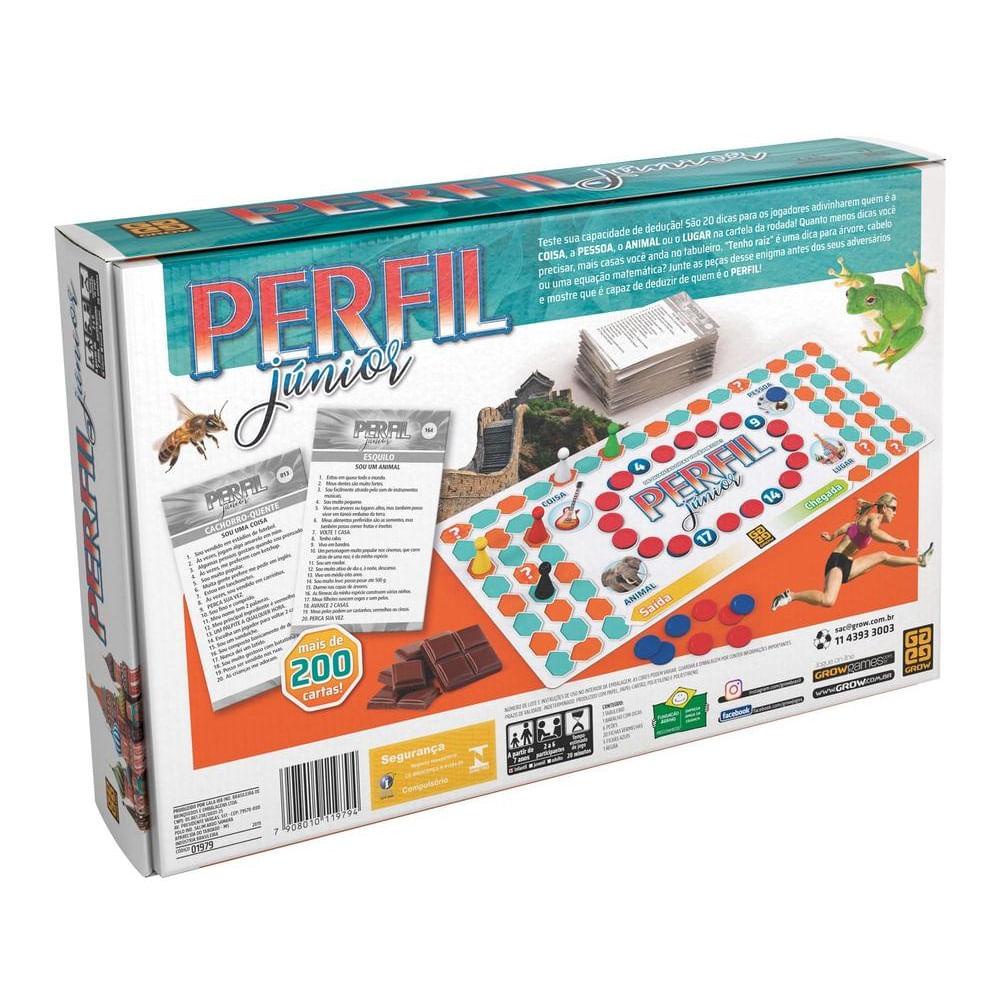 Jogo Perfil Junior - GrowO jogo Perfil Junior da Grow é um clássico repaginado, pensado especialmente para a criançada! Com perguntas e desafios adaptados para a mente dos pequenos, ele proporciona momentos de diversão e aprendizado. Ideal para 2 a 6 participantes, o jogo estimula o raciocínio lógico e a capacidade de dedução dos jogadores. Diferenciais:Cartas com perfis secretos para os participantes descobrirem. Quanto menos dicas utilizadas para acertar, mais pontos são ganhos. Inclui manual com todas as regras do jogo para facilitar a diversão. Mais sobre o Produto:O jogo de tabuleiro Perfil Junior traz dicas sobre pessoas, anos, coisas ou lugares para os jogadores adivinharem a resposta. Cada rodada apresenta um perfil secreto, e os participantes recebem dicas para descobri-lo. Quem conseguir acertar com menos pistas, pontua mais! Dicas de Uso:Reúna a criançada, distribua as cartas e comece a rodada! Siga as instruções do manual para entender as regras e mergulhe na diversão de descobrir os perfis secretos. Estimule o pensamento crítico e a interação entre os participantes com o jogo Perfil Junior - Grow. Ficha Técnica:Marca: Grow; Nome do produto: Jogo Perfil Junior; Idade recomendada: A partir de 7 anos; Selo Inmetro: CE-BRI/ICEPEX-N 01264-25 NM300/2004 0046; Contém: 1 tabuleiro, 200 cartelas com dicas, 6 peões, 20 fichas vermelhas, 5 fichas azuis e 1 manual de instruções.