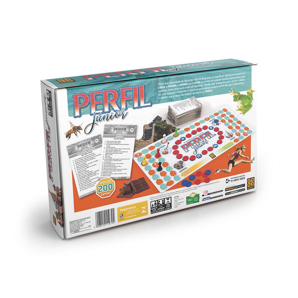 Jogo Perfil Júnior Um clássico agora pensado para a criançada! Chame os pequenos para se divertirem com o jogo Perfil Júnior! Usando os moldes do jogo clássico, as perguntas e desafios foram adaptados para a mente das crianças. Será que elas vão conseguir descobrir o Perfil? Como jogar Perfil Júnior? O jogo de tabuleiro Perfil Júnior é ideal para 2 a 6 participantes a partir dos 7 anos! Com conteúdo feito especialmente para crianças, o jogo de perguntas traz dicas sobre pessoas, anos, coisas ou lugares para elas deduzirem a resposta! A cada rodada, uma carta com um perfil secreto é sorteada. Um a cada vez, os jogadores vão recebendo dicas sobre o perfil secreto em questão. Quanto menos dicas você utilizar para acertar, mais pontos irá ganhar! Todas as regras do jogo Perfil Júnior estão incluídas junto com o manual do jogo. Basta encontrar suas companhias, seguir as regras e partir para a diversão! Idade: A partir de 07 anos Participantes: 2 a 6 participantes Tempo estimado de jogo: Indeterminado