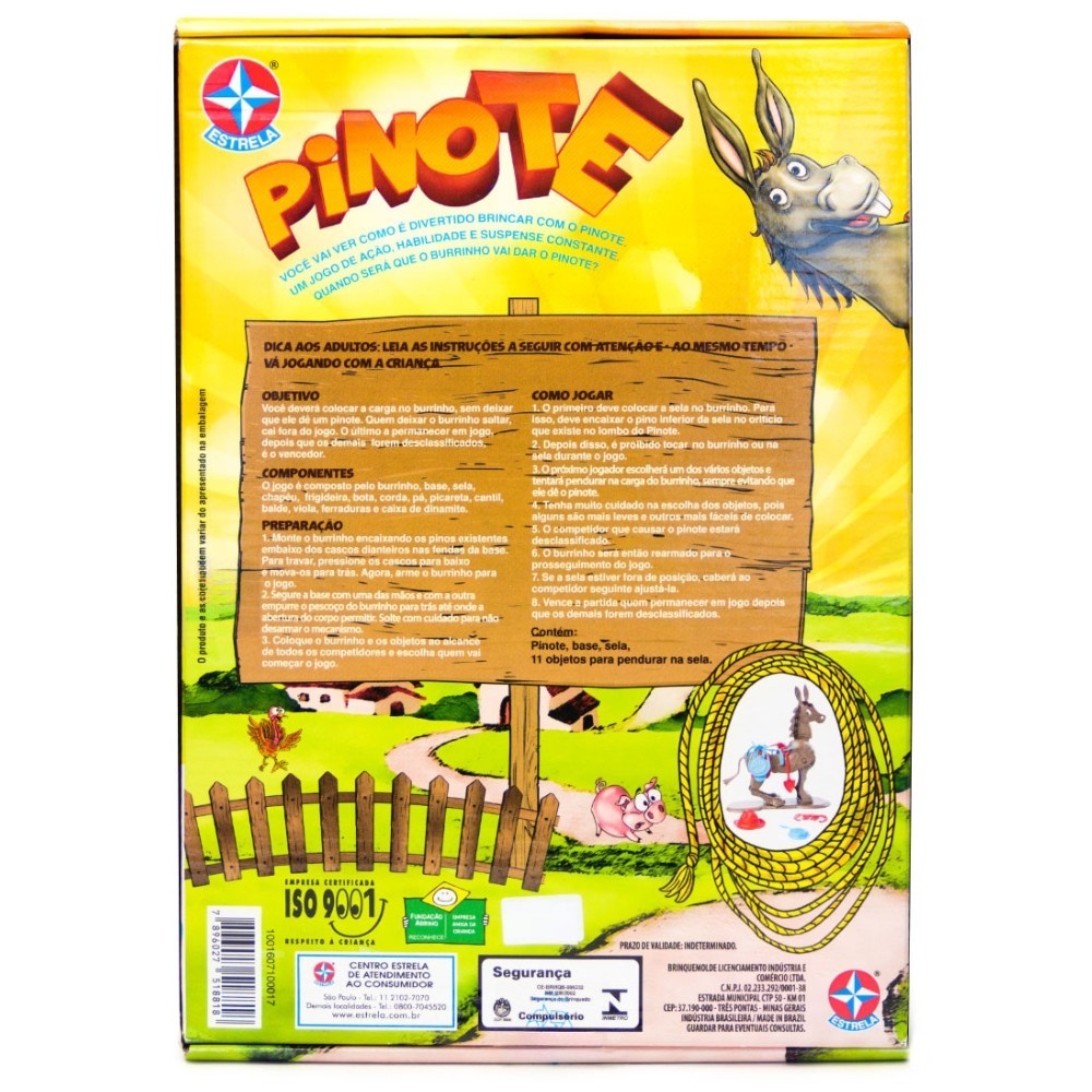 ***PRODUTO ESTRELA EM PORTUGUÊS ORIGINAL, OFICIAL, LACRADO E COM NOTA FISCAL*** JOGO PINOTE ESTRELA BURRINHO ESTRATÉGIA AÇÃO HABILIDADE FAMÍLIA BRINQUEDO INFANTIL CAVALO SELA MESA Você vai ter que mostrar toda a sua habilidade. Só quem não deixar o Pinote saltar é que será o domador vitorioso! Tente prender tudo no pinote! Você vai ver como é divertido brincar com o pinote. Um jogo de ação, habilidade e suspense constante. Quando será que o burrinho vai dar o pinote? DICA AOS ADULTOS: LEIA AS INSTRUÇÕES A SEGUIR COM ATENÇÃO E AO MESMO TEMPO VÁ JOGANDO COM A CRIANÇA OBJETIVO: Você deverá colocar a carga no burrinho, sem deixar que ele dê um pinote. Quem deixar o burrinho saltar, cai fora do jogo. O último a permanecer em jogo, depois que os demais forem desclassificados, é o vencedor. COMPONENTES: O jogo é composto pelo burrinho, base, sela, chapéu, frigideira, bota, corda, pá, picareta, cantil, balde, viola, ferraduras e caixa de dinamite. PREPARAÇÃO: 1. Monte o burrinho encaixando os pinos existentes embaixo dos cascos dianteiros nas fendas da base. Para travar, pressione os cascos para baixo e mova-os para trás. Agora, arme o burrinho para o jogo. 2. Segure a base com uma das mãos e com a outra empurre o pescoço do burrinho para trás até onde a abertura do corpo permitir. Solte com cuidado para não desarmar o mecanismo. 3. Coloque o burrinho e os objetos ao alcance de todos os competidores e escolha quem vai começar o jogo. COMO JOGAR: 1. O primeiro deve colocar a sela no burrinho. Para isso, deve encaixar o pino inferior da sela no orifício que existe no lombo do Pinote. 2. Depois disso, é proibido tocar no burrinho ou na sela durante o jogo. 3. O próximo jogador escolherá um dos vários objetos e tentará pendurar na carga do burrinho, sempre evitando que ele dê o pinote. 4. Tenha muito cuidado na escolha dos objetos, pois alguns são mais leves e outros mais fáceis de colocar. 5. O competidor que causar o pinote estará desclassificado. 6. O burrinho será então rearmado para o prosseguimento do jogo. 7. Se a sela estiver fora de posição, caberá ao competidor seguinte ajusta-la. 8. Vence a partida quem permanecer em jogo depois que os demais forem desclassificados. Contém: Pinote, base, sela, 11 objetos para pendurar na sela. Informações Técnicas: - Material: Plástico - Contém: 01 pinote, 01 base, 01 sela e 11 objetos para pendurar na sela. - EAN: 7896027518818 - Produto certificado INMETRO REGISTRO: 001 771/2020 - Peso 490g - JOGO - 5+ ANOS - De 1 ou mais jogadores - ESTRELA - Garantia: Contra defeitos de fabricação - Prazo de Validade: Indeterminado Obs: O produto e as cores podem variar do aprensentado nas fotos da embalagem. ATENÇÃO! NÃO RECOMENDÁVEL PARA CRIANÇAS MENORES DE 3 (TRÊS) ANOS POR PODER GERAR PARTE(S) PEQUENA(S) QUE PODE(M) SER ENGOLIDA(S) OU ASPIRADA(S). --------------------------------------------------- SEJA MUITO BEM VINDO(A) A LOJA DE BRINQUEDOS DO CANAL 40 POR QUÊ COMPRAR NA LOJA DE BRINQUEDOS DO CANAL 40? *Enviamos seu pedido sempre no mesmo dia ou no máximo no próximo dia útil dependendo do horário da sua compra! *Produtos lacrados, originais e oficiais da mais alta qualidade; *Experiência única de compra (incluindo a experiência olfativa - você sentirá nosso cheiro); *Todos os nossos produtos estão à pronta entrega em nosso estoque físico aqui no Brasil; *Seu pedido será enviado com segurança e agilidade; IMPORTANTE: Tenha tranquilidade de comprar com quem está disposto a te oferecer o melhor atendimento, caso tenha algum problema após a compra, conte com nossa equipe de pós venda para solucioná-lo! A LOJA DE BRINQUEDOS DO CANAL 40 tem a missão de garantir a satisfação total do seu cliente, tanto nos produtos quanto no atendimento. Assim estabelecemos uma relação única de confiança! Não encontrou o que procurava? Clique na foto da nossa logo para entrar em nossa loja e ver todos os nossos produtos OU nos mande uma mensagem diretamente aqui pelo chat. SERÁ UM PRAZER ATENDÊ-LO(A)! --------------------------------------------------- MUITO PRAZER, ME CHAMO FELIPE CAMARGO, SOU DONO, CEO E CRIADOR DE CONTEÚDO DO CANAL 40. DESDE JÁ, DEIXO AQUI O MEU MUITO OBRIGADO!!! CANAL 40 - LOJA DE BRINQUEDOS LTDA DEIXE SUA CRIANÇA INTERIOR FELIZ E APROVEITE!