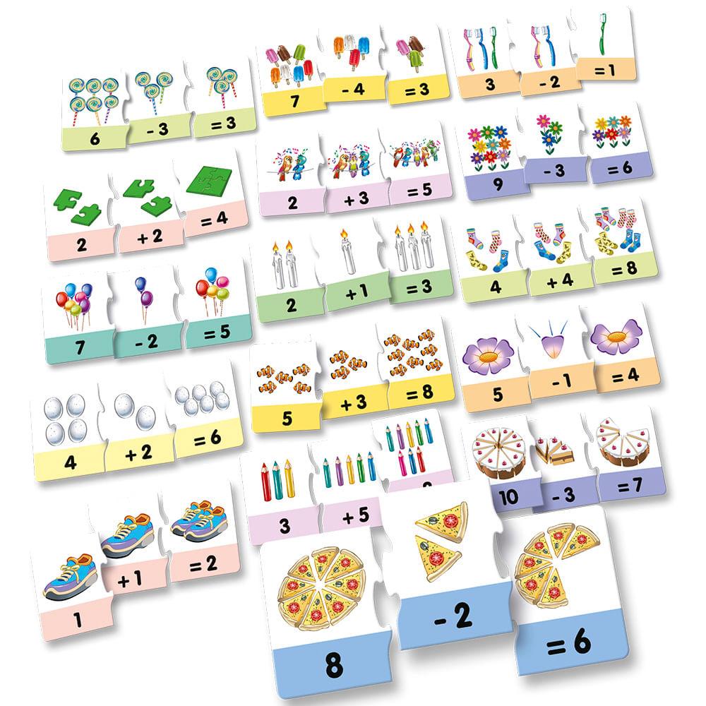 Linha Brincando & Aprendendo Grow Exercita o raciocínio lógico através da associação de imagens. Primeiras contas é um hogo que promove o interesse pelas operações matemáticas de soma e subtração com ajuda das imagens nas cartelas. A crianças deve procurar as cartelas com imagens semelhantes e organizá-las de forma lógica para chegar ao resultado correto. As cartelas contêm imagens e sinais matemáticos que auxiliam na visualização das operações de adição e subtração. A partir de 4 anos Participantes: 1 ou mais Contém: 16 cartelas com 3 peças cada