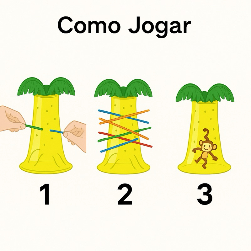 📦 ENVIO EM ATÉ 24H – PRODUTO PRONTA ENTREGA O Jogo Pula Macacos / Cada Macaco no Seu Galho é um brinquedo divertido que desenvolve estratégia, raciocínio e coordenação. O objetivo é simples: não deixar os macaquinhos caírem da árvore! ⸻ 🐒 COMO JOGAR 1. Monte a palmeira. 2. Insira as varetas coloridas pelos furos laterais. 3. Coloque os macaquinhos sobre as varetas. 4. Cada jogador retira uma vareta sem deixar os macacos despencarem. 🔥 Ganha quem derrubar MENOS macaquinhos! ⸻ 📦 ITENS INCLUSOS • 1 Palmeira de 15 cm • Varetas coloridas • Macaquinhos • Base de encaixe ⸻ ✔ CARACTERÍSTICAS • Não usa pilhas • Material: plástico resistente • Certificado INMETRO • Recomendado para maiores de 5 anos • Fácil de montar • Compacto para levar em viagens