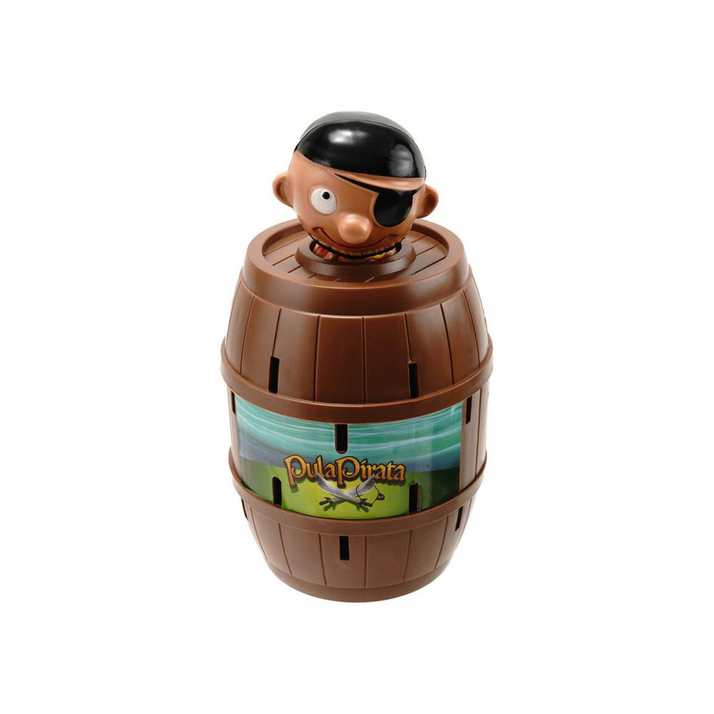 Uma espadinha aqui... outra ali... E de repente o pirata pula fora do barril! Espete o barril com cuidado, porque ninguém sabe quando ele vai pular! Peças: - 1 Pirata - 1 Barril - 24 Espadinhas - 1 Cartela de Adesivo