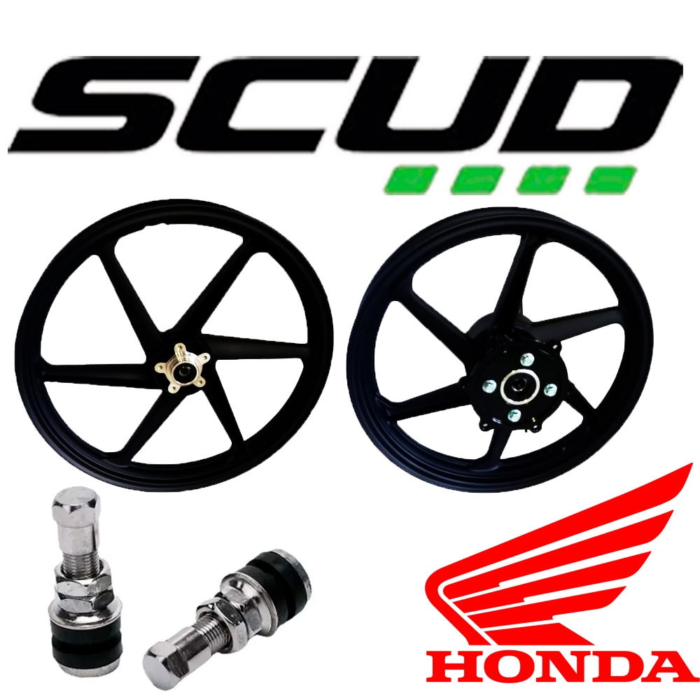 Freio a Disco Dianteira e Freio Tambor na Traseira Roda de Liga Leve Preta de 6 Pontas Honda Bros 150 ESD Honda Bros 160 Bros ESD Roda Dianteira Aro 19 Roda Traseira Aro 17 Características Alta Resistência Modelo: 6 pontas Material: liga leve Cor: preta Aplicação As rodas Scud são fabricadas com matéria prima nobre, construídas em sistema de injeção de alumínio de alta tecnologia, o que proporciona além de muita leveza, um ótimo acabamento, altíssima qualidade e resistência. - Este jogo de roda já é fornecido com todos os rolamentos, espaçadores e retentores o que facilita a montagem; - Com exclusivo design Scud, e uma embalagem inédita, as rodas Scud chegaram para revolucionar o mercado. Marca Scud