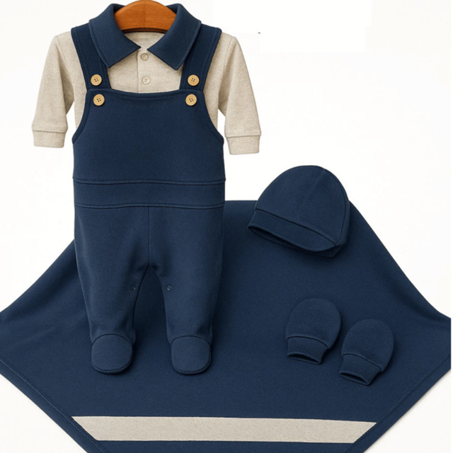 Jogo Saída de Maternidade 5 Peças Azul Marinho com Manta Masculina Infantil Boné Luva