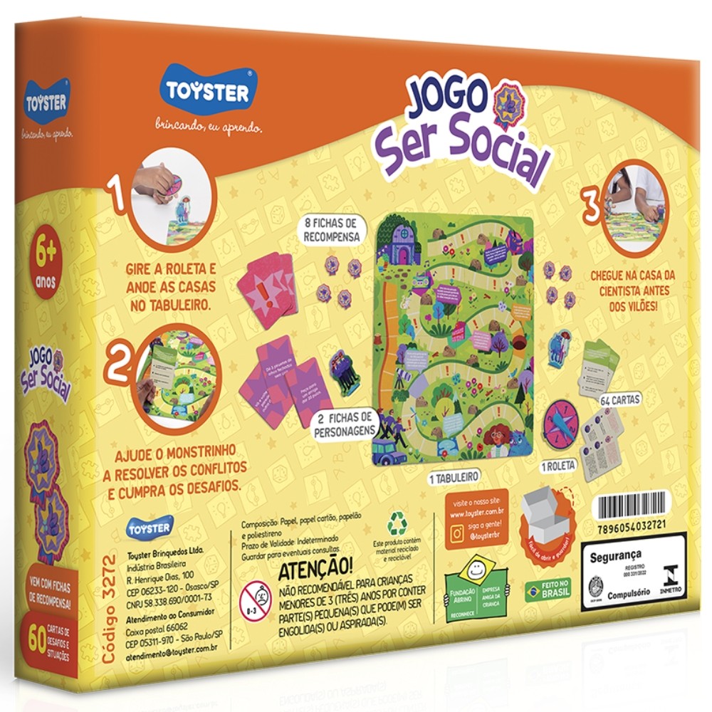 ***PRODUTO TOYSTER EM PORTUGUÊS, ORIGINAL, OFICIAL, LACRADO E COM NOTA FISCAL*** JOGO SER SOCIAL TOYSTER BRINQUEDO MONSTRINHO RESOLVER CONFLITO COMUNICAÇÃO TABULEIRO CUMPRIR DESAFIO Informações Técnicas: - Material: Papel, Papel Cartão, Papelão e Poliestireno - Contém: 8 fichas de recompensas, 2 fichas de personagens, 1 tabuleiro, 1 roleta, 64 cartas,. - EAN: 7896054032721 - Código: 3272 - Produto certificado REGISTRO: 000331/2022 - Peso: 440g - JOGO EDUCATIVO - IDADE: 6 anos - Marca: TOYSTER - Linha: TOYSTER - Garantia: Contra defeitos de fabricação - Prazo de Validade: Indeterminado Obs: O tamanho de cada peça pode sofrer variações. Faça o descarte consciente e preserve o meio ambiente. Imagens meramente ilustrativas. ATENÇÃO! NÃO RECOMENDÁVEL PARA CRIANÇAS MENORES DE 3 (TRÊS) ANOS POR PODER GERAR PARTE(S) PEQUENA(S) QUE PODE(M) SER ENGOLIDA(S) OU ASPIRADA(S). --------------------------------------------------- SEJA MUITO BEM VINDO(A) A LOJA DE BRINQUEDOS DO CANAL 40 POR QUÊ COMPRAR NA LOJA DE BRINQUEDOS DO CANAL 40? *Enviamos seu pedido sempre no mesmo dia ou no máximo no próximo dia útil dependendo do horário da sua compra! *Produtos lacrados, originais e oficiais da mais alta qualidade; *Experiência única de compra (incluindo a experiência olfativa - você sentirá nosso cheiro); *Todos os nossos produtos estão à pronta entrega em nosso estoque físico aqui no Brasil; *Seu pedido será enviado com segurança e agilidade; IMPORTANTE: Tenha tranquilidade de comprar com quem está disposto a te oferecer o melhor atendimento, caso tenha algum problema após a compra, conte com nossa equipe de pós venda para solucioná-lo! A LOJA DE BRINQUEDOS DO CANAL 40 tem a missão de garantir a satisfação total do seu cliente, tanto nos produtos quanto no atendimento. Assim estabelecemos uma relação única de confiança! Não encontrou o que procurava? Clique na foto da nossa logo para entrar em nossa loja e ver todos os nossos produtos OU nos mande uma mensagem diretamente aqui pelo chat. SERÁ UM PRAZER ATENDÊ-LO(A)! --------------------------------------------------- MUITO PRAZER, ME CHAMO FELIPE CAMARGO, SOU DONO, CEO E CRIADOR DE CONTEÚDO DO CANAL 40. DESDE JÁ, DEIXO AQUI O MEU MUITO OBRIGADO!!! CANAL 40 - LOJA DE BRINQUEDOS LTDA DEIXE SUA CRIANÇA INTERIOR FELIZ E APROVEITE!