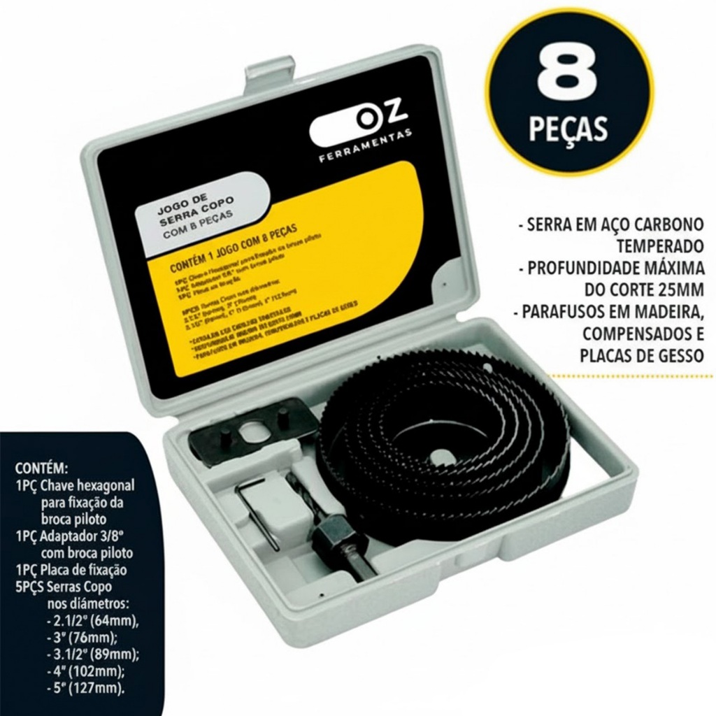 Distribuído por Ismafer Ferramentas JOGO DE SERRA COPO JS800 OZ Ideal para a criação de furos de diversos diâmetros em uma ampla gama de materiais, como madeira, compensados, fibra, telha, plástico, gesso, Drywall, tubos de PVC e metais leves. Com esse kit de serras copo em aço carbono você poderá fazer cortes limpos e suaves em madeiras, plásticos, gesso e metais leves. Completo para seu trabalho no dia a dia. Ótima opção de custo-benefício com utilidade profissional e hobby. O kit vem acondicionado em uma maleta organizadora, totalizando 8 peças. Características: - Composição: Serra em aço carbono temperado, garantindo durabilidade e resistência. - Profundidade máxima de corte: 25mm Conteúdo da Embalagem: - 01 placa de fixação; - 01 adaptador 3/8” com broca piloto; - 01 chave hexagonal para fixação da broca piloto; - 02 serras copo com diâmetro de 2.1/2” (64mm) e 3” (76mm); - 03 serras copo com diâmetro de 3.1/2” (89mm), 4” (102mm) e 5” (127mm). Marca: Oz Modelo: JS800 Garantia: 90 Dias SKU: 24653 Distribuído por Ismafer Ferramentas