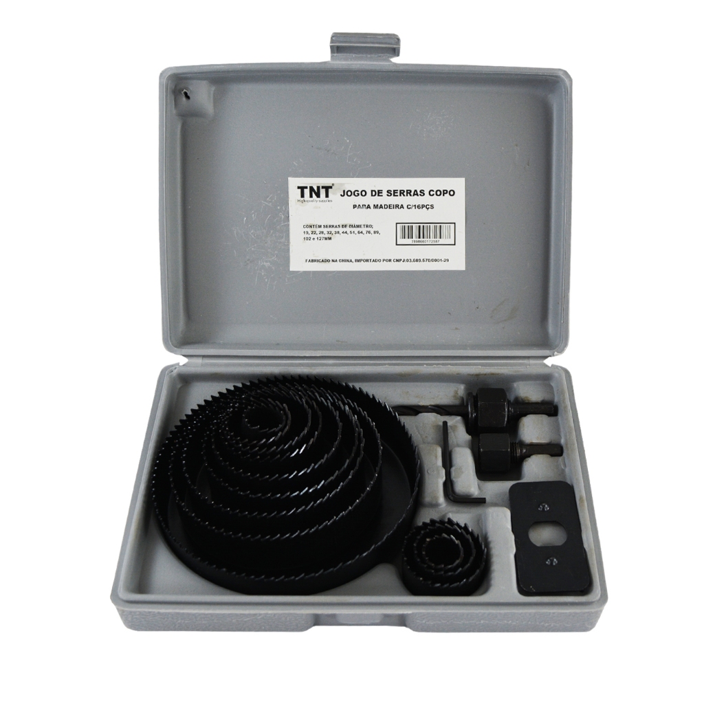 Jogo de serra copo para madeira, com 16 pçs. Inclui suportes com broca piloto e serras com diâmetro de; 01 - 19mm 01 - 22mm 01 - 28mm 01 - 32mm 01 - 38mm 01 - 44mm 01 - 51mm 01 - 64mm 01 - 76mm 01 - 89mm 01 - 102mm 01 - 127mm Projetado como bicos para furadeira manual ou elétrica. Permite sem trabalhos preliminares fazer furos de diâmetro entre 19 e 127mm em madeira, aglomerado, gesso, painéis de fibra, entre outros