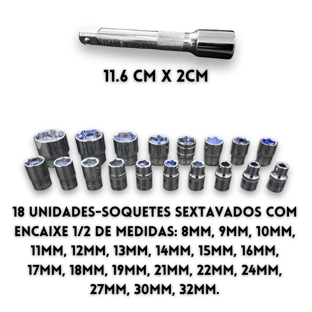 💠 ➡️ DISPONÍVEL EM ESTOQUE ⬅️ 💠 💠📦 APÓS A COMPRA SER APROVADA ENVIO O MAIS BREVE POSSÍVEL (DIAS ÚTEIS) 📦 💠 Kit Completo de Soquetes SEXTAVADOS 1/2" - 22 Peças com Maleta Domine qualquer tarefa com este kit completo de ferramentas! O que você recebe: 18 Soquetes SEXTAVADOS 1/2": Medidas: 8mm, 9mm, 10mm, 11mm, 12mm, 13mm, 14mm, 15mm, 16mm, 17mm, 18mm, 19mm, 21mm, 22mm, 24mm, 27mm, 30mm e 32mm Aço cromo vanádio para máxima durabilidade Acabamento cromado para resistência à corrosão Encaixe perfeito para parafusos e porcas sextavadas 1 Extensão 1/2" x 5" (125mm): Alcance extra para áreas de difícil acesso 1 Extensão 1/2" x 10" (250mm): Alcance ainda maior para tarefas complexas 1 Catraca Reversível 1/2": Troca rápida de direção para maior eficiência 72 dentes para torque preciso 1 Adaptador para Cabo T 1/2": Versatilidade para usar com diferentes ferramentas Maleta compacta e resistente: Mantenha suas ferramentas organizadas e protegidas Transporte fácil para qualquer lugar Dimensões: 37 cm x 25 cm x 7,8 cm Peso: 3,39 kg Ideal para: Profissionais e entusiastas do DIY Reparos automotivos Manutenção doméstica Projetos de construção E muito mais! Invista na qualidade e na praticidade! Este kit completo de soquetes estriados oferece tudo que você precisa para realizar diversos trabalhos com rapidez e precisão. As ferramentas são fabricadas em aço cromo vanádio de alta qualidade e possuem acabamento cromado para maior durabilidade e resistência à corrosão. A maleta compacta garante organização e praticidade no transporte. Não perca tempo e adquira já o seu kit! 💠 Produto em estoque, envio imediato! 💠 【ATENDIMENTO ATRAVÉS DO CHAT】 💠 Se você tiver alguma dúvida antes, durante ou após a compra? Por favor entre em contato conosco! 💠 Basta clicar no ícone "𝗖𝗵𝗮𝘁" no canto inferior direito da tela. 【GARANTIA SHOPEE】 💠 Se o produto estiver danificado ou apresentar defeitos de fabricação ou problemas durante o transporte, não hesite em nos contatar, OK? 💠 Por favor, não nos dê uma classificação de uma estrela, entre em contato conosco! Obrigado por comprar conosco! Temos o compromisso de fornecer aos senhores(a) os melhores produtos, suporte e serviços! 💠 GIMI COMÉRCIO 💠