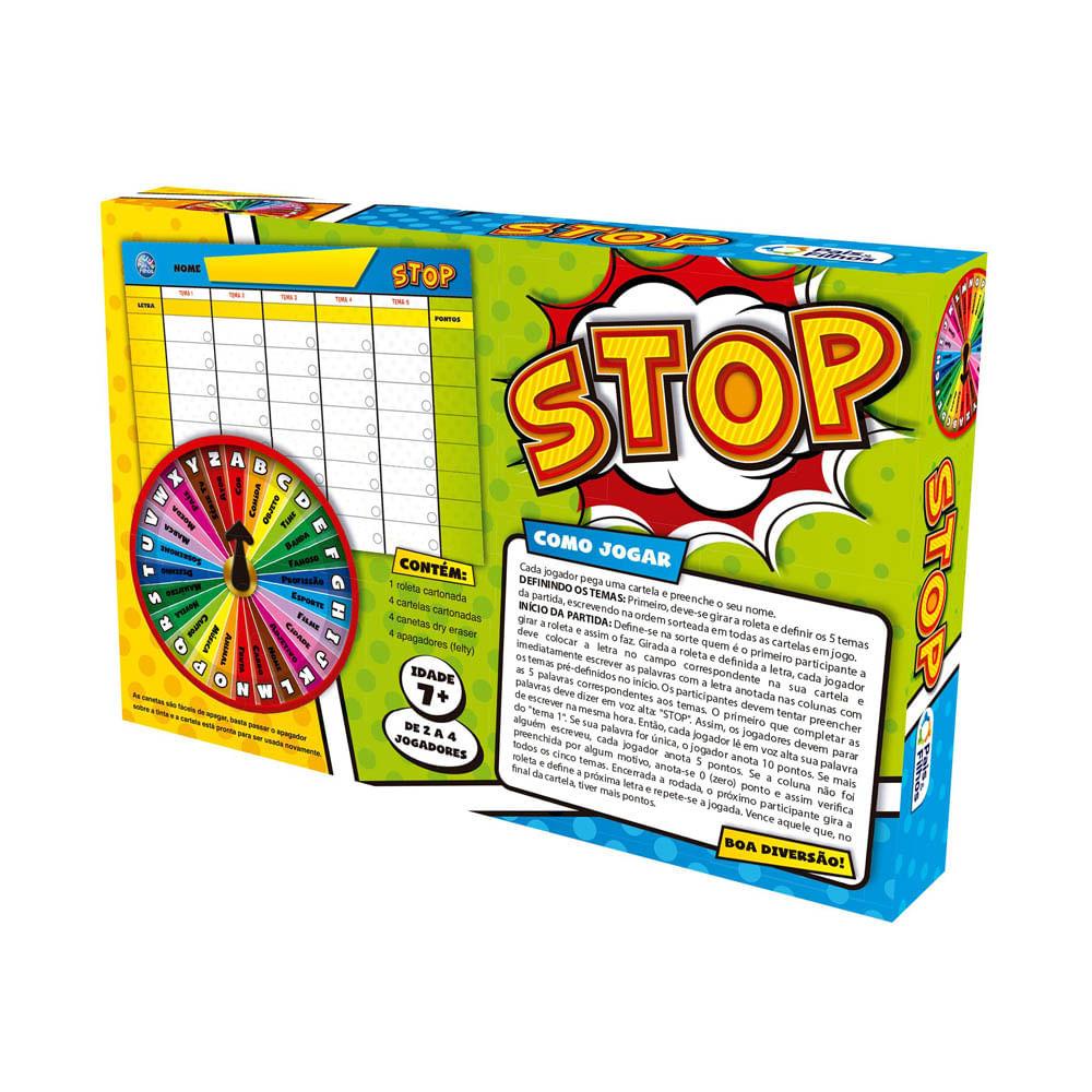 Jogo Stop - Pais e FilhosDê um toque de diversão e criatividade aos seus momentos em família com o Jogo Stop - Pais e Filhos. Seja o mais rápido em pensar nas palavras que se encaixam nos temas propostos e grite "Stop!" para pontuar. Com cartelas e canetas apagáveis, a brincadeira fica ainda mais dinâmica e envolvente. Desafie suas habilidades de raciocínio e agilidade neste jogo emocionante, enquanto se diverte com a família e amigos. Diferencial:Cartelas e canetas apagáveis para facilitar a brincadeira e tornar o jogo mais fluído. Mais sobre o Produto:Este jogo é ideal para toda a família se divertir reunida, proporcionando momentos de interação e alegria. Estimula o pensamento rápido e a criatividade, tornando cada partida dinâmica e envolvente. Indicado para meninas e meninos de 7 a mais de 14 anos, é perfeito para quem gosta de desafios. Dicas de Uso:Antes de iniciar a partida, gire a roleta para definir os temas e a letra da rodada. Cada jogador deve preencher as palavras relacionadas aos temas com a letra escolhida. Ao completar as palavras, grite "Stop!" e pontue de acordo com as regras. Alterne a vez de girar a roleta e continue até o final da rodada. Divirta-se e desafie a família para uma competição saudável e animada! Ficha Técnica:Marca: Pais e Filhos; Nome do produto: Jogo Stop; Idade recomendada: A partir de 7 anos; Selo Inmetro: 003730/2019 Contém: 1 Roleta Cartonada, 4 Cartelas Cartonadas, 4 Canetas Dry Eraser, 4 Apagadores.