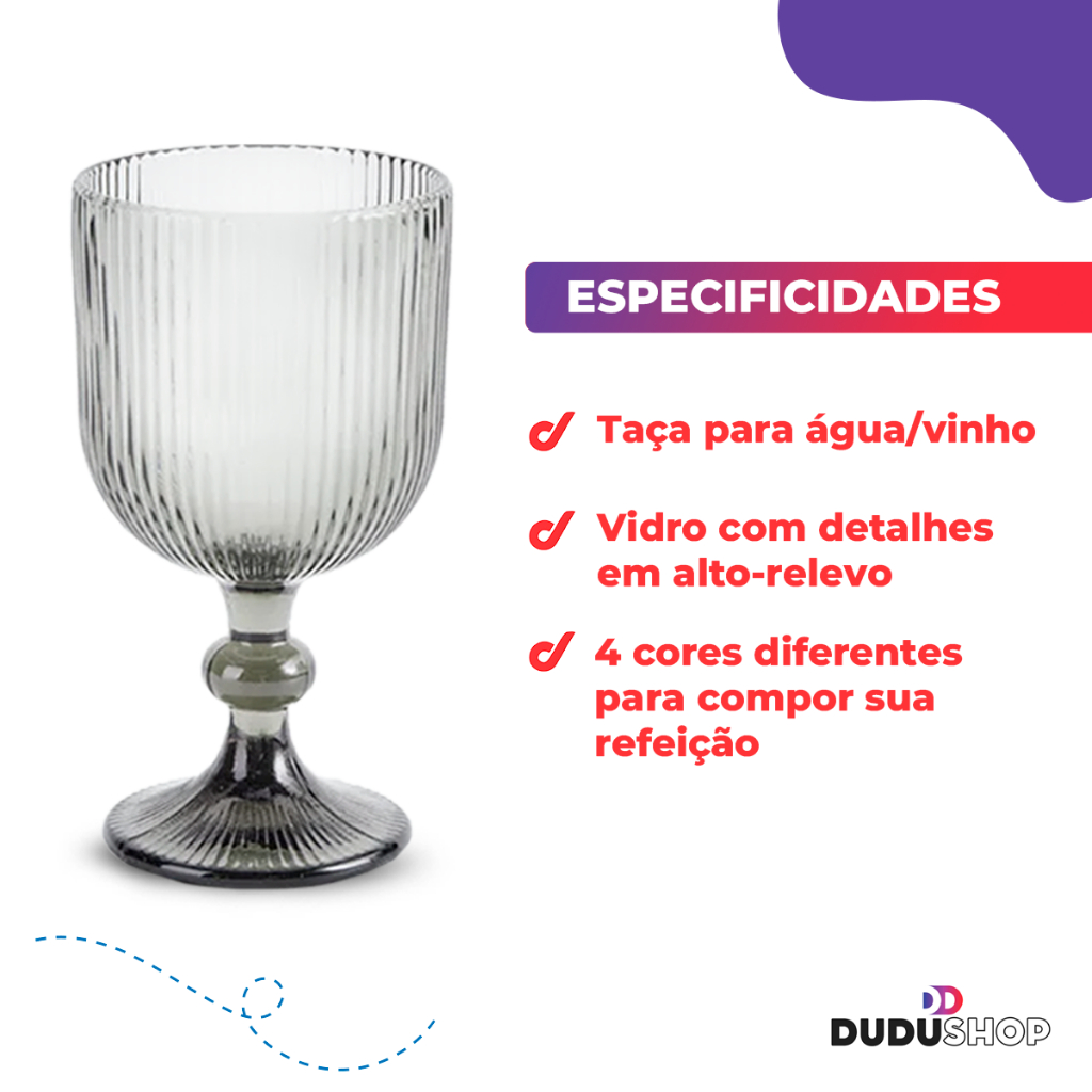 A taça canelada de 380 ml em vidro é um tipo de copo projetado com um design elegante e funcional. Feita de vidro, possui detalhes em relevo ou canelados ao redor do corpo da taça, o que não apenas proporciona um visual atraente, mas também facilita a aderência ao segurar. Este tipo de taça é comumente utilizado para servir diferentes tipos de bebidas, como água, sucos, refrigerantes ou até mesmo coquetéis, em ambientes que valorizam tanto a estética quanto a praticidade na hora de servir. Cores: Marsala, Fume, Azul, Âmbar, Transparente Capacidade: 380ml ***Diferentes monitores e dispositivos podem interpretar as cores das fotos de maneiras diferentes***