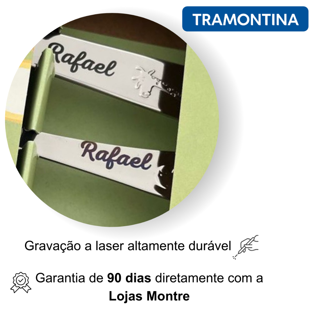 Jogo de Talheres Infantil Tramontina Baby Friends em Aço Inox – 4 Peças – Personalizável O Jogo de Talheres Infantil Tramontina Baby Friends em Aço Inox foi desenvolvido para tornar as refeições das crianças mais divertidas e seguras. Com 4 peças (colher, garfo, faca e colher curvada), cada talher é projetado com formato ergonômico, tornando mais fácil o manuseio pelos pequenos, incentivando a autonomia e o desenvolvimento motor. Produzido em aço inox de alta qualidade, o conjunto é durável, seguro e não libera resíduos nos alimentos, garantindo refeições saudáveis. Principais benefícios: * Material 100% aço inox – Garantia de durabilidade e higiene. * Formato ergonômico e desenhos em alto-relevo – Facilita o uso e torna a alimentação mais divertida. * Acabamento brilhante – Preserva a beleza e o brilho das peças por muito mais tempo. * Fácil manutenção – Pode ser lavado na máquina de lavar louças. * Desenvolvido para crianças a partir de 36 meses – Ideal para incentivar a alimentação independente. * Personalização Exclusiva – Como Funciona? * A personalização é feita a laser pela Lojas Montre, na cor preta. * O cliente pode escolher a fonte ou optar pelo padrão da foto. * Após a compra, envie o nome a ser gravado no chat ou no campo de perguntas. * Caso o nome não seja informado, o produto será enviado sem gravação. * Importante: Como o produto é personalizado, a garantia para defeitos de fabricação deve ser tratada diretamente com a Lojas Montre dentro do prazo de 90 dias. DÚVIDAS FREQUENTES * Qual a idade indicada para o uso deste jogo de talheres? O Jogo de Talheres Infantil Tramontina Baby Friends é recomendado para crianças a partir de 36 meses. * Posso lavar os talheres na máquina de lavar louças? Sim! O conjunto pode ser lavado diariamente na máquina de lavar louças sem perder o brilho. * Como manter o brilho dos talheres de inox? Utilize sabão neutro e enxágue bem os talheres. Sempre que possível, use água quente para renovar o brilho. Evite esponjas abrasivas e o contato com superfícies quentes para preservar a qualidade do material. * Como funciona a garantia? A garantia é de 90 dias para vícios ou defeitos de fabricação e deve ser acionada diretamente com a Lojas Montre. Envio rápido e seguro para todo o Brasil. Garanta já o seu Jogo de Talheres Infantil e personalize com o nome da criança.