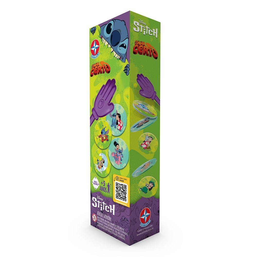Jogo Tapa Certo Stitch - EstrelaO Jogo Tapa Certo Stitch da Estrela proporciona muita diversão para crianças. As cartas quadradas são viradas para baixo, enquanto as cartas redondas ficam expostas. Um jogador vira uma carta quadrada, revelando uma imagem, e todos os participantes devem dar um tapa rápido com a mãozinha plástica na carta redonda que contém a mesma figura. Este jogo estimula a agilidade e a percepção visual das crianças, promovendo uma experiência lúdica e interativa. Diferenciais:Temática divertida do Stitch e seus amigos alienígenas. Estimula a agilidade e a percepção visual. Ideal para crianças a partir de 5 anos. Produto da Estrela. Mais sobre o Produto:O jogo desenvolve habilidades motoras e cognitivas, favorece a interação entre os jogadores e oferece uma experiência fácil de aprender e muito divertida. Produzido com material resistente e durável, garante longos momentos de diversão. Indicado para meninas e meninos de 5 a mais de 14 anos, é ideal para quem gosta de se desafiar brincando. Dicas de Uso:Reúna amigos e familiares para uma competição animada. Estabeleça desafios e prêmios para tornar o jogo ainda mais emocionante. Alternem os participantes para que todos possam se divertir e participar ativamente. Estimule a concentração e a agilidade dos jogadores para tornar as partidas ainda mais dinâmicas e desafiadoras. Ficha Técnica:Marca: Estrela; Nome do produto: Jogo Tapa Certo Stitch; Idade recomendada: A partir de 5 anos; Selo Inmetro: 009 246 /2019; Contém: 45 fichas quadradas, 45 fichas redondas, 2 "mãozinhas" com ventosas.