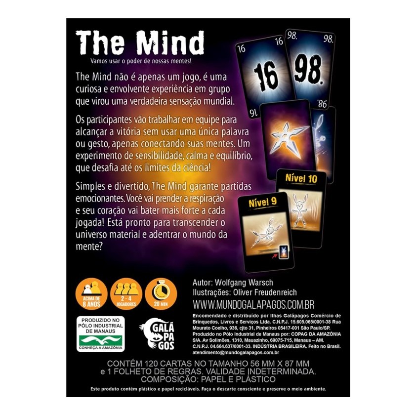 The Mind não é apenas um jogo, é a uma curiosa e envolvente experiência em grupo que virou uma verdadeira sensação mundial. Os participantes vão trabalhar em equipe para alcançar a vitória sem usar uma única palavra ou gesto, apenas conectando suas mentes. Um experimento de sensibilidade, calma e equilíbrio, que desafia até os limites da ciência! Simples e divertido, The Mind garante partidas emocionantes. Você vai prender a respiração e seu coração vai bater mais forte a cada jogada! Está pronto para transcender o universo material e adentrar o mundo da mente? Contém: 100 Cartas com números, 12 Níveis, 5 Vidas, 3 Estrelas Ninja. Especificações Fabricante: Galápagos Ref.: TMI001 Cód. Barras: 7898572674841 Idade recomendada: 8+ Não recomendado para crianças menores de 03 anos. 2 a 4 jogadores Dimensões da embalagem (AXLXC): 14 x 11 x 3 cm Peso: 150g Garantia do vendedor: 7 dias Garantia do fabricante: 3 meses Produto original, novo, lacrado e acompanhado de Nota Fiscal.