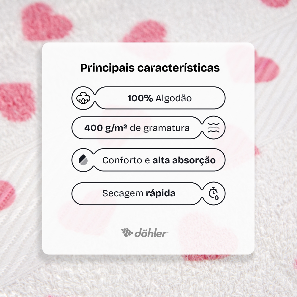 Jogo de toalha de banho e rosto 100% Algodão Prisma Döhler - Kit com 2 Transforme a rotina do banho em um momento de bem-estar e aconchego com o jogo de toalhas Prisma, da Döhler. Feitas em 100% algodão e com gramatura de 400 g/m², elas oferecem o equilíbrio ideal entre maciez, absorção eficiente, durabilidade e secagem rápida, garantindo uma experiência confortável todos os dias. As opções de estampas e cores vivas, com detalhe em viscose no barrado, adicionam um toque de charme e elegância à decoração do banheiro. É a escolha perfeita para quem busca toalhas de banho macias, bonitas e funcionais em um único produto. Características que fazem a diferença: 100% algodão: fibras naturais que proporcionam conforto Gramatura 400 g/m²: espessura ideal para um toque macio e secagem rápida Alta absorção: seca a pele com sensação de abraço no pós banho Detalhe em viscose no barrado: brilho sutil e toque acetinado Diversas estampas: mais estilo para a decoração do seu banheiro Toque macio prolongado: mantém a suavidade após as lavagens Ficha técnica do jogo de toalhas Prisma 01 Toalha de Rosto – 50cm x 80cm 01 Toalha de Banho – 70cm x 140cm Composição: 100% algodão Gramatura: 400g/m² (acima da média do mercado) Modelo: Prisma Marca: Döhler, indústria com mais de 140 anos no Brasil Cuidados para garantir a durabilidade das toalhas Lavar antes do primeiro uso; Lavar em processo suave; Evitar alvejantes; Secar à sombra ou em temperatura baixa; Passar em temperatura média.