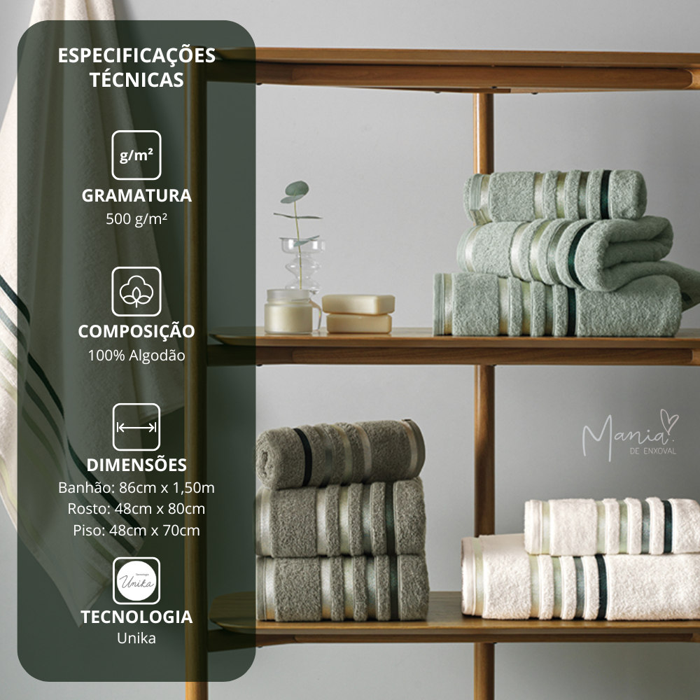 O Jogo de Toalhas 5 peças Lumina é ideal para quem não abre mão do conforto na hora do banho. As peças confeccionas com o corpo 100% em algodão tem o exclusivo acabamento Antipilling que aumenta a durabilidade do produto e não deixa formar as indesejáveis bolinhas no tecido. Além disso, as toalhas possuem um toque super macio e uma excelente absorção. O charme da coleção Lumina consiste na barra trabalhada e na combinação de cores que vão deixar o banheiro ainda mais elegante. Contém: 1 Toalha de Piso Juliet 48cm x 70cm 2 Toalhas Banhão 86cm x 1,50m 2 Toalhas de Rosto 48cm x 80cm Composição: Corpo 100% Algodão Gramatura: 500g/m Pré-encolhidas Antipilling Fio Penteado