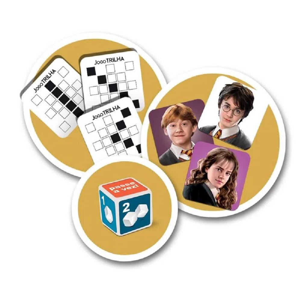 Jogo Trilha Harry Potter - Elka Um jogo de sorte, estrategia e os personagens favoritos de Harry Potter. O Objetivo do jogo é montar 5 imagens do seu persongem sorteado, na sequência que está na sua carta de trilha. O dado especial indica os movimentos de cada jogador a cada lance, e tudo pode mudar! Vence quem completar o desafio em 3 rodadas. Selo Inmetro: CE-BRI/IQB 001290/2020 OCP 0006
