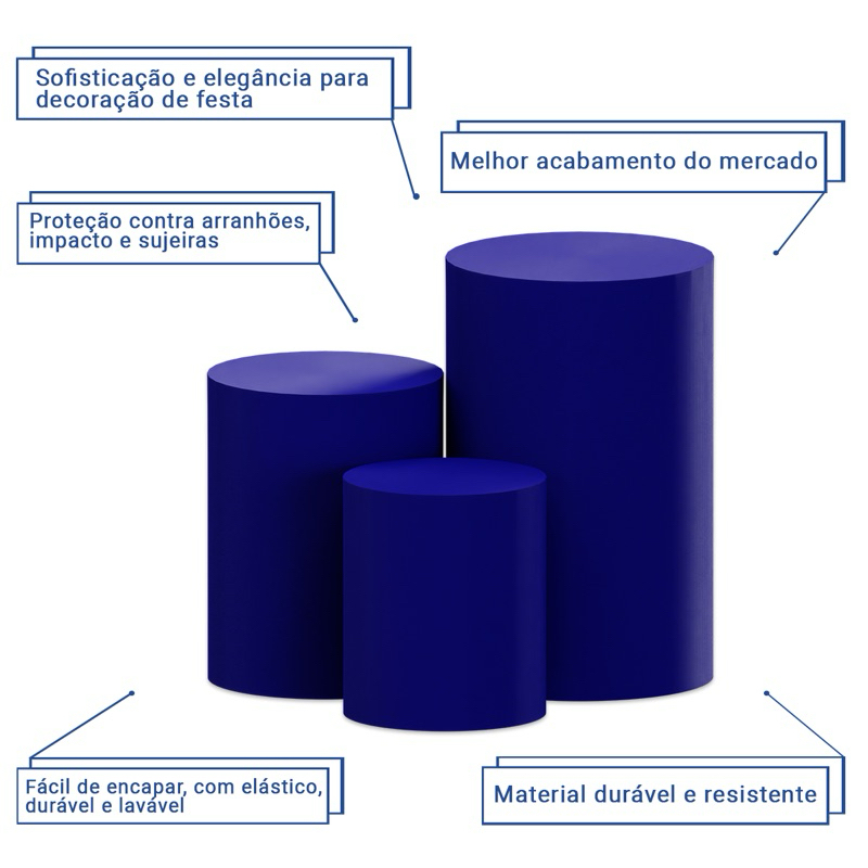 Jogo Trio Capas Cilindro Festa Azul Marinho Tecido Helanca Elastano Decoração Mesas Redondas MDF Aniversário Casamento