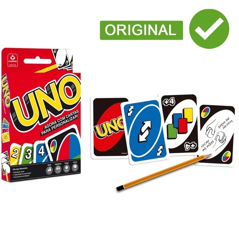 JOGO UNO (DIVERSÃO) 112 CARTAS (BENEFÍCIOS/CARACTERÍSTICAS): - TAMANHO DA CARTA PADRÃO - MATERIAL MAIS RESISTENTE (PAPEL DURINHO) - LAYOUT ATUALIZADO - CARTAS COMPLETAS - PREÇO ACESSÍVEL - ENVIO IMEDIATO Os jogos desenvolvem a interação social, capacidade de associação e pensamento estratégico, além de proporcionar entretenimento para toda a família e amigos! Relaxem juntos🧡💯 Diversão Garantida Imagens ilustrativas.