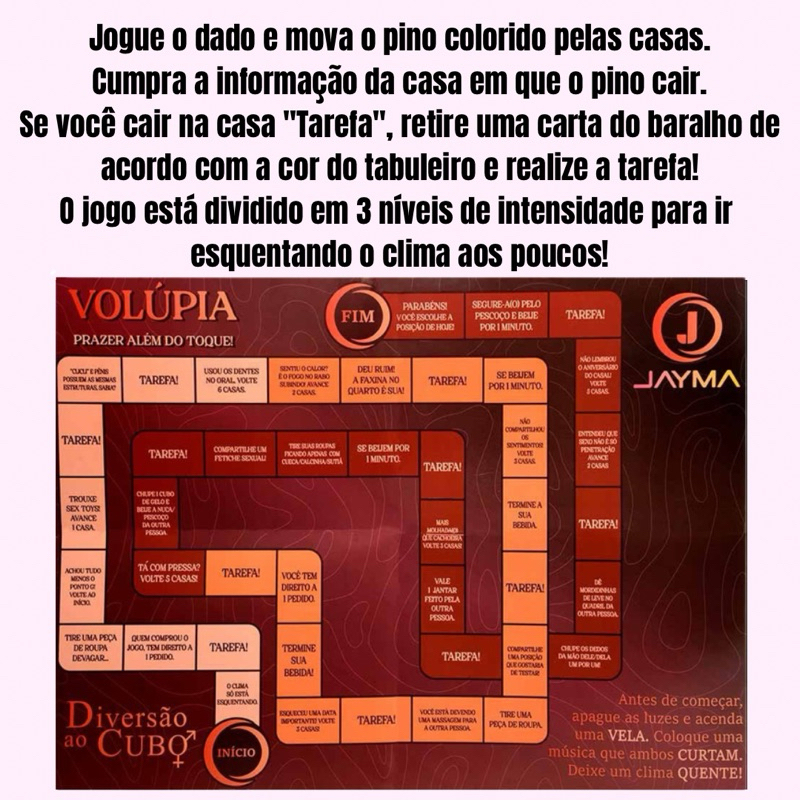 Jogo Volúpia de Tabuleiro com cartas dados jogo para casal diversão ao cubo Um divertido jogo com tarefas e informações para casais curtirem um momento diferente! Instruções: • Jogue o dado e mova o pino colorido pelas casas. • Cumpra a informação da casa em que o pino cair. • Se você cair na casa "Tarefa", retire uma carta do baralho de acordo com a cor do tabuleiro e realize a tarefa! • O jogo está dividido em 3 níveis de intensidade para ir esquentando o clima aos poucos! Antes de começar, apague as luzes e acenda uma VELA. Coloque uma música que ambos CURTAM. Deixe um clima QUENTE! Contém: 02 pinos 01 dado 01 tabuleiro 30 cartas.