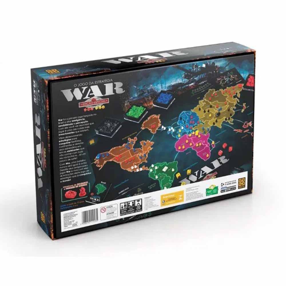 Jogo War Edição Especial Pack - GrowMergulhe na experiência épica de War, o jogo de estratégia que desafia até os maiores estrategistas! Cada partida é uma nova batalha onde você, como um verdadeiro general, deve usar toda sua habilidade militar para conquistar territórios, dominar continentes e derrotar seus adversários. Idade recomendada: A partir de 10 anos. Selo Inmetro: ?CE-BRI/ICEPEX-N 01024-25 - NM300-2004 - OCP. Diferenciais:Cada jogador recebe uma missão secreta que deve ser cumprida para vencer. Sua estratégia começa aqui! Avalie suas tropas, analise o terreno e planeje seus movimentos. Um ataque bem planejado pode mudar o rumo da batalha. Escolha o momento certo para atacar e não se esqueça de proteger suas fronteiras. A defesa é tão importante quanto o ataque! Domine continentes, expanda seu império e prove que você é o melhor estrategista do campo de batalha. Mais sobre o Produto:Nenhuma partida de War é igual a outra, garantindo uma nova experiência a cada jogo. Reúna seus amigos e descubra por que War é o jogo de estratégia mais jogado do Brasil. Quem será o próximo a dominar o mundo? Mesmo pequenos exércitos podem se tornar grandes impérios com a estratégia certa. Conheça bem suas tropas e nunca subestime o poder de um bom plano. Dicas de Uso:Explore diferentes estratégias de jogo para surpreender seus adversários. Divirta-se planejando ataques e defesas de forma inteligente. Aproveite os detalhes das miniaturas para mergulhar ainda mais na atmosfera do jogo. Ficha Técnica:Marca: Grow; Nome do produto: Jogo War Edição Especial Pack; Idade recomendada: A partir dos 10 anos; Selo Inmetro: ?CE-BRI/ICEPEX-N 01024-25 - NM300-2004 - OCP; Contém: 1 tabuleiro, 6 conjuntos de exércitos de cores diferentes, 6 caixas plásticas com tampas, 14 cartas-objetivos, 42 cartas de territórios, 2 cartas curingas, 3 dados vermelhos, 3 dados amarelos e 1 manual de instruções.