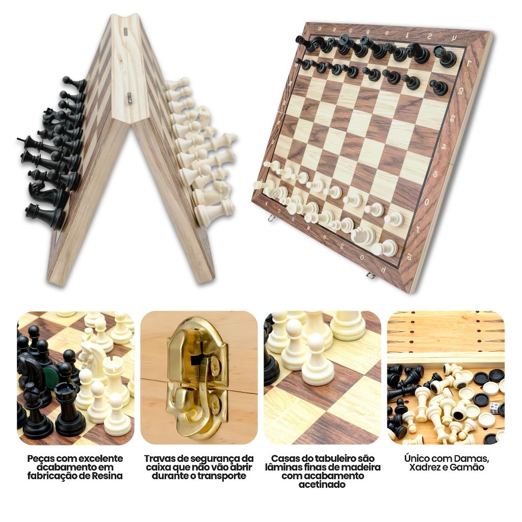 | Jogo Xadrez Magnético com Damas e Gamão Tabuleiro de 29 cm em Madei... este produto | R$ 69,90 | — | 4.8/5 | 6 |