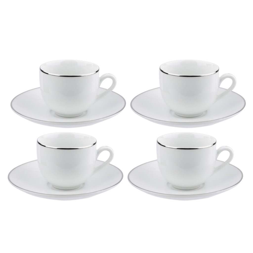 Jogo Xicaras De Café Com Pires 90ml Porcelana Kit 4 Peças Borda Prata Luxo Legacy Silver