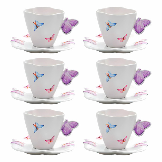Jogo Xicaras de Chá Café Com Pires Kit 6 Peças 200ml Borboleta Wolff Porcelana
