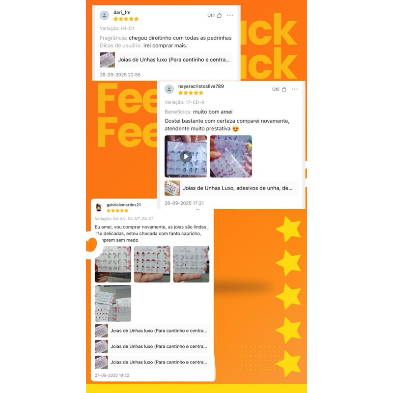 Nossa Empresa é especialista em decoração de unhas. A nossas Joias de unha pode ser usada em unhas naturais e alongamentos. Mantendo as unhas sempre linda e delicadas. As joias alem de ter diversas cores e modelos combina com qualquer esmalte e pode ser usada nas unhas das mãos e dos pés. Elas são super flexíveis e adere perfeitamente a curvatura das unhas. Cada Cartelão vai com 10 pares. São montadas artesanalmente usamos 50% Goma Laca e 50% base própria para película E ai, Qual vai ser a cor das suas joias? Modo de Aplicar: 1- Remova a joia com o auxílio de umas espátula. 2- Recorte as sobras no tamanho da unha. 3- Aplique sobre a unha já esmaltada. 4- Finalize com uma camada de base ou extra brilho.