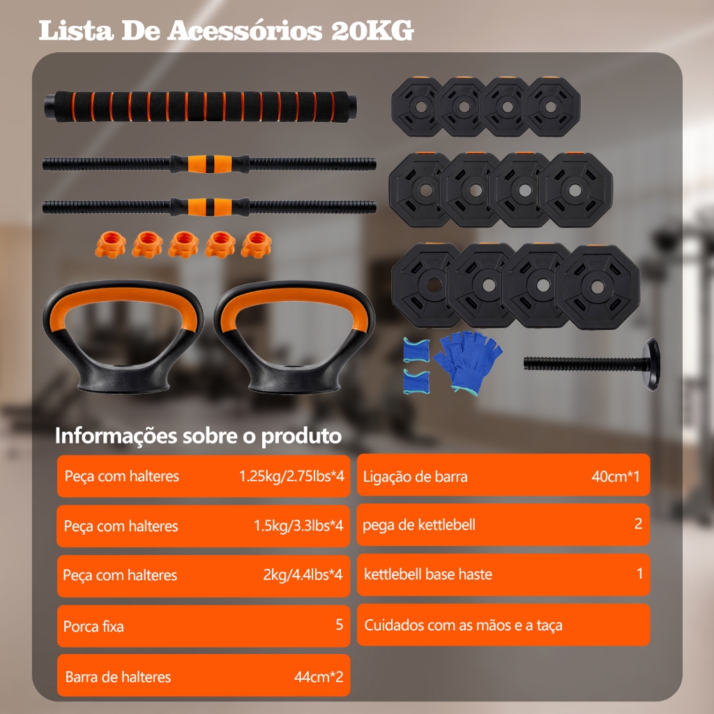 Observação: este link oferece três pesos diferentes: 10 kg, 20 kg e 30 kg. Selecione o peso desejado para a compra.Cada categoria de peso tem um preço diferente. Conjunto multifuncional de halteres 6 em 1 Com o conjunto de halteres ajustáveis, você pode elevar o nível dos seus treinos em casa. Transforme-o facilmente em halteres, barras, kettlebells e barras de flexão, alterne os modos de exercício como quiser. Um conjunto de halteres 6 em 1 pode atender às suas necessidades de ginástica em casa e proporcionar um treino multifacetado Design ergonômico e materiais duráveis O exterior do conjunto de halteres ecológico é feito de materiais PE de alta qualidade, que evitam o desgaste do piso, são seguros e à prova de som. A curvatura da espuma é projetada de acordo com a curva do pescoço humano, que se adapta melhor ao pescoço e reduz a pressão sobre ele, tornando-o mais seguro e confortável Segurança aprimorada com porca dupla As porcas de travamento duplo aprimoradas aumentam a segurança além da dos halteres multifuncionais comuns. As roscas das porcas mais grossas garantem um encaixe seguro no haltere ou na barra, mantendo as peças do haltere bem fixas, o que permite que você se concentre totalmente no treino e se exercite com mais tranquilidade. Estrutura antiderrapante aprimorada O conjunto de halteres ajustáveis tem um design razoável, com o punho do haltere feito de material de alta qualidade, a superfície tem uma textura antiderrapante para se ajustar melhor à mão, reforçar o atrito, prevenir eficazmente a transpiração e o deslizamento, e proporcionar uma utilização mais estável. Peso ajustável e aproveitamento do espaço de armazenamento O conjunto de halteres possui um design destacável e a faixa de peso ajustável para cada haltere é de 2 kg a 10 kg, o que atende efetivamente às suas diferentes necessidades de exercício durante várias fases. Fácil de instalar e ocupa pouco espaço de armazenamento. ITENS INCLUSOS: Peso: Ajustável (até 20Kg) 4 anilhas de 1,25kg cada 4 anilhas de 1,5kg cada 4 anilhas de 2kg cada 2 Barras Rosqueáveis 1 Barra Rosqueável com Proteção de EVA 1 Base para Kettlebell 2 Puxadores para Kettlebell (com função dupla de apoios para flexão) 5 Roscas para as Barras Rosqueáveis Um par de guardas do pulso Um par de luvas