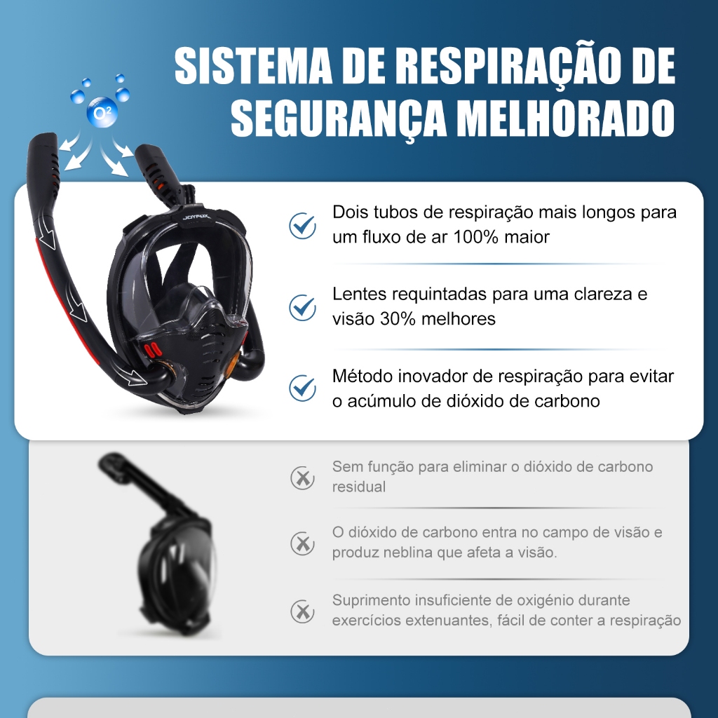 Joyfox Full Snorkel Mask - Tubo Dual, Mist e Vista Panorámica de 180 ° Explorar a liberdade do mundo submarino com a máscara completa de snorkeling Joyfox projetada especificamente para adultos e crianças. Seu projeto inovador de tubos duplos e ajuste anti-nevoeiro asseguram respiração suave e natural, ao mesmo tempo que gozam de vistas claras debaixo da água. Panorámica 180 Nossas máscaras têm um campo de visão 50% maior que máscaras tradicionais de mergulho e são projetadas com características anti-nevoeiro, proporcionando aos usuários uma visão clara de 180° sob a água dentro de algumas horas de mergulho, snorkeling ou nadar. Separação respiratória de tubos duplos Comparado com as máscaras respiratórias mais completas no mercado, o design de máscara respiratória dual de nosso produto aumenta o fluxo de ar em 100%, proporcionando aos usuários a mesma experiência respiratória submarina e superficial suave. Válvula separada de escape Nosso design patentado de deflector de gás utiliza válvulas de uma direção e câmaras de respiração independentes para separar e circular ar fresco e gás exhalado, reduzindo efetivamente os níveis de dióxido de carbono em máscaras e assegurando uma experiência segura para todos os usuários. Design completamente resistente à água seca Após a perla flutuante afundar no mar, ela sube devido à flotação, bloqueando os buracos de ventilação e impedendo a entrada da água do mar. Após a perla flutuante subir para a superfície, a gravidade diminui e a ingestão de ar é aberta para continuar a respirar. Comfortável para usar Este produto é feito de silicone mole, que não vai causar alergias ao seu rosto. É fácil limpar após uso e é particularmente adequado para mergulho livre a longo prazo sem se sentir desconfortável. Tamanhos disponíveis Essa máscara de snorkeling S/M e L/XL vem em dois tamanhos, adequada para crianças e adultos. Recomendamos que você medi cuidadosamente suas dimensões faciais de acordo com nossas diretrizes antes de comprar para assegurar medidas precisas e uma experiência de mergulho mais segura. Especificações: Cor: Negro Carga de máscara: silicone Área transparente de máscara: PC Área opaca de máscara: ABS Material de lente: lente anti-nevoeiro Tamanhos disponíveis: S/M e L/XL Contente: 1 * Máscara de neve 1 * Saco de armazenamento Como usar uma máscara de mergulho? Usa uma máscara de mergulho: Usa a máscara na cabeça, assegurando que as bordas coincidam com a sua cara. Ajusta a banda de estiramento e aperta sua cabeça para garantir que a máscara não se desliga. Carregando um tubo de mergulho: Ajusta o tubo de mergulho à posição apropriada e conecta-o à cinta de vidro para manter o tubo de mergulho vertical. Coloque o nozzle de silicone na boca.