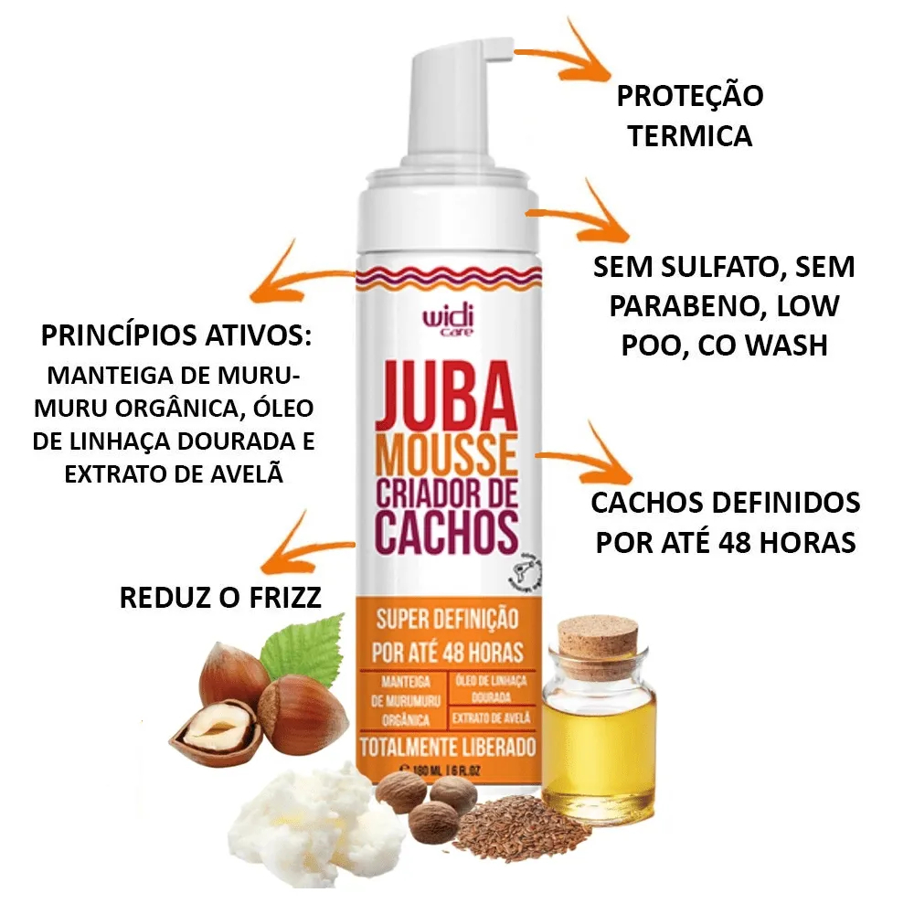 Produto Liberado para técnica No poo e Low Poo Juba Mousse Criador de Cachos - 180ML - Widi Care ajuda a definir e manter os cachos sem frizz durante todo o dia. O mousse condiciona e proporciona uma incrível definição, além de contar com proteção térmica. Cabelos incrivelmente lindos, definidos, macios e sem frizz. Passo a passo de como usar Coloque uma pequena quantidade do Juba Mousse na palma da mão, Aplique nos cabelos úmidos friccionando da nuca para frente, raiz às pontas. Modele com difusor ou deixe secar naturalmente, Para um efeito ainda mais definido, seque com difusor de baixo para cima.