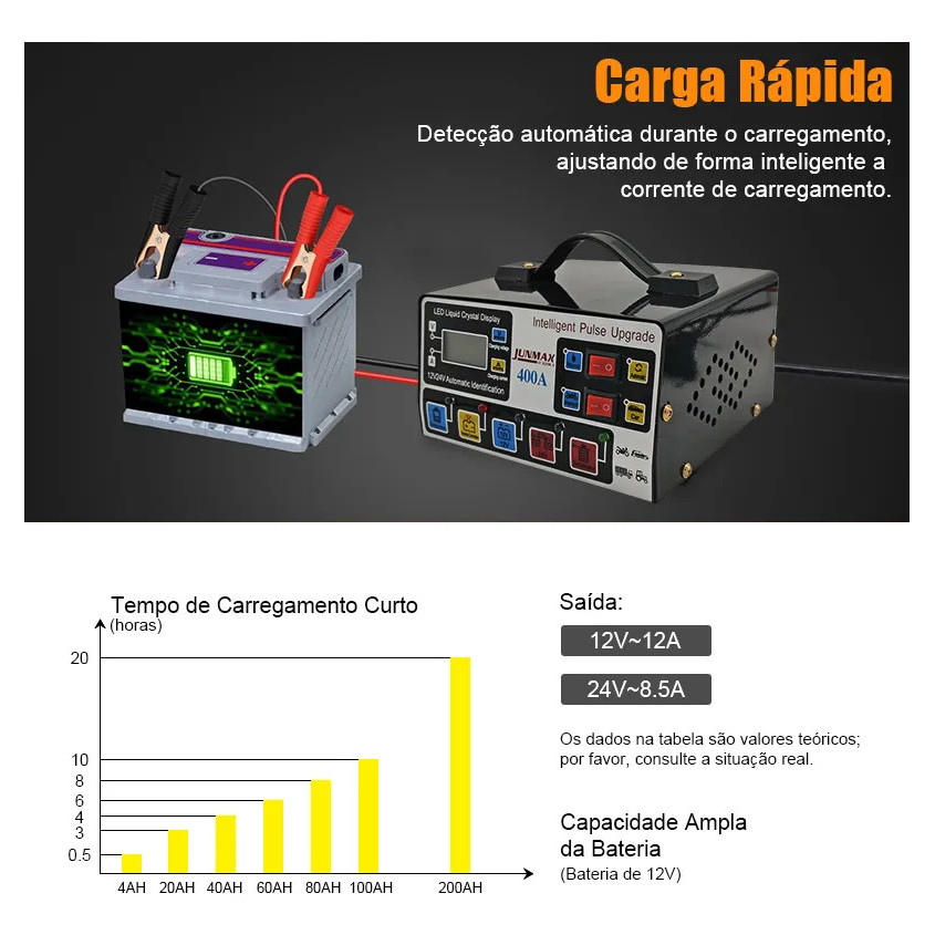 | JUMLEE Carregador de Bateria 12V 24V 400A Inteligente Automotivo Co... este produto | R$ 145,99 | 44% | 4.7/5 | — |
