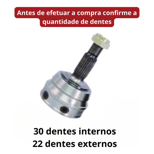 ATENÇÂO: Junta homocinética lado roda (externa) - Serve para ambos os lados. Não serve em veículos com ABS! Não serve para motores 1.0 EA111 (Gol/Parati/Saveiro 2000+). Medidas Técnicas: Diâmetro externo do flange (tulipa do câmbio): 90 mm 30 dentes internos / 22 dentes externos (Tem variações 33 x 22 e 30 x 26 no mercado — não serve!) Este anúncio contem: 1 (Uma) junta homocinetica; 1 (Uma) Coifa; 2 (Duas) Abraçadeiras; 1 (Uma) Graxa. Aplicável nos seguintes veículos: Montadora: Volkswagen; Veículo: Fox; Motor: 1.0; Ano de fabricação: 2004, 2005, 2006, 2007, 2008. Montadora: Volkswagen; Veículo: Saveiro; Motor: 1.6, 1.8, 2.0; Ano de fabricação: 1987, 1988, 1989, 1990, 1991, 1992, 1993, 1994, 1995. Observações: Somente versões SEM ABS e com motor AP. Montadora: Volkswagen; Veículo: Gol; Motor: 1.6, 1.8, 2.0; Ano de fabricação: 1986, 1987, 1988, 1989, 1990, 1991, 1992, 1993, 1994. Observações: Somente versões SEM ABS e com motor AP. Montadora: Ford; Veículo: Royale; Motor: 1.8, 2.0; Ano de fabricação: 1992. Observações: Somente versões SEM ABS e com motor AP. Montadora: Ford; Veículo: Versailles; Motor: 1.8, 2.0; Ano de fabricação: 1991, 1992. Observações: Somente versões SEM ABS e com motor AP. Montadora: Volkswagen; Veículo: Parati; Motor: 2.0; Ano de fabricação: 1988, 1989, 1990, 1991, 1992, 1993, 1994, 1995. Observações: Somente versões SEM ABS e com motor AP. Montadora: Volkswagen; Veículo: Parati; Motor: 1.8; Ano de fabricação: 1982, 1983, 1984, 1985, 1986, 1987, 1988, 1989, 1990, 1991, 1992, 1993, 1994, 1995. Observações: Somente versões SEM ABS e com motor AP. Montadora: Volkswagen; Veículo: Parati; Motor: 1.6; Ano de fabricação: 1986, 1987, 1988, 1989, 1990, 1991, 1992, 1993, 1994, 1995, 1996. Observações: Somente versões SEM ABS e com motor AP. Montadora: Volkswagen; Veículo: Passat; Motor: 1.6, 1.8; Ano de fabricação: 1987, 1988. Observações: Somente versões SEM ABS e com motor AP. Montadora: Volkswagen; Veículo: Quantum; Motor: 1.8, 2.0; Ano de fabricação: 1986, 1987, 1988, 1989, 1990, 1991, 1992. Observações: Somente versões SEM ABS e com motor AP. Montadora: Volkswagen; Veículo: Santana; Motor: 1.8, 2.0; Ano de fabricação: 1984, 1985, 1986, 1987, 1988, 1989, 1990, 1991, 1992. Observações: Somente versões SEM ABS e com motor AP. Montadora: Volkswagen; Veículo: Voyage; Motor: 1.6, 1.8; Ano de fabricação: 1987, 1988, 1989, 1990, 1991, 1992, 1993, 1994, 1995, 1996. Observações: Somente versões SEM ABS e com motor AP. Outras características; Inclui sensor ABS: Não; Inclui abraçadeira: Sim; Inclui coifa: Sim Inclui graxa: Sim; Quantidade de dentes internos: 30; Quantidade de dentes externos: 22. A nossa auto peças comercializa apenas produtos originais de fabricantes certificado pelo ISO 9001. Sobre o produto: A junta homocinética conecta o cubo da roda ao semieixo da transmissão e este último ao eixo do câmbio, transmitindo potência de maneira eficiente em diferentes angulações entre eixos. Como esse componente é responsável pela transmissão da energia gerada pelo motor às rodas, é considerado um elemento de segurança para o carro. Caso ocorram falhas ou quebra nessa junta, a energia produzida pelo motor não será mais transmitida para as rodas, provocando a parada total do veículo. Prevenção e Manutenção: Compre sempre um Amortecedor automotivo de procedência garantida, e com as mesmas especificações do fabricante. As peças devem ser substituídas de acordo com as instruções do fabricante, sempre verificando as condições dos demais componentes do sistema, lembrando que choques mecânicos podem comprometer o funcionamento. Sobre a Empresa: Desde 1984 buscando a satisfação de nossos clientes. Nossa autopeças trabalha com as melhores marcas do setor automotivo, e aqui você encontrará as melhores peças para seu carro, sempre visando a qualidade e o melhor atendimento, todos nossos produtos são testados e embalados de forma com que chegue até você da melhor maneira, só trabalhamos com peças novas, originais ou importadas de 1ª linha, nossas peças contam com 3 meses de garantia por defeito de fabricação seguindo nossa política de trocas, garantia e devoluções. Dúvidas frequentes: O Produto é novo? Sim. Nós trabalhamos apenas com produtos novos, e com garantia. O Produto é original? Sim. Nós só trabalhamos com distribuidores homologados pelo fabricante. Tem garantia? Sim. Todos nossos produtos têm 90 dias de garantia de fabrica contra defeitos de fabricação, exceto os amortecedores que possuem 2 anos de garantia total. O produto é igual ao da foto? Sim. Todas as fotos são fiéis ao que você receberá, e para facilitar a sua compra, ilustramos também o veículo em que se aplica o produto. Em quanto tempo recebo minha compra? É muito simples, basta colocar seu CEP no calculador de frete do anúncio. Envia ainda hoje? Sim. Comprando até as 12:00 postaremos no mesmo dia. IMPORTANTE: No ato da compra, caso necessário, enviaremos uma mensagem confirmando algumas informações, como: a