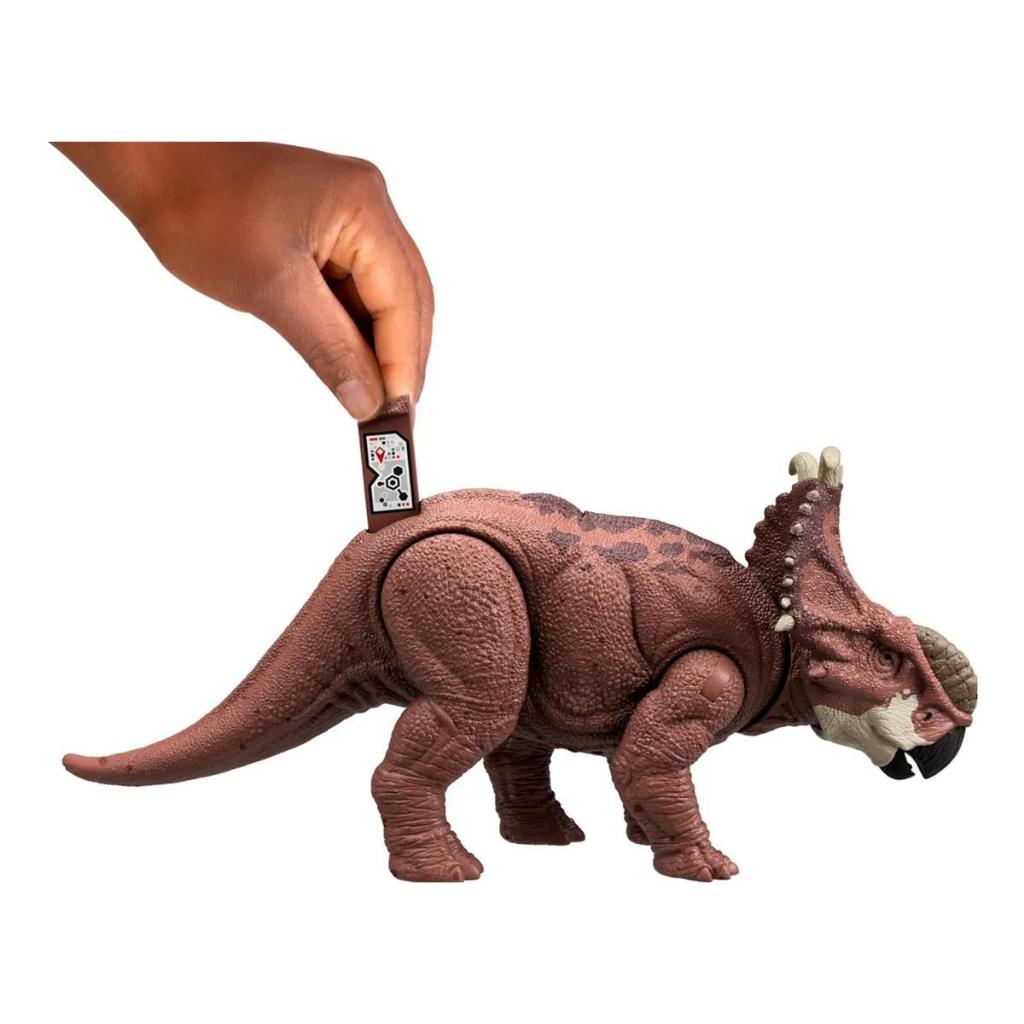 Prepare-se para rugir e ser feroz com este boneco do dinossauro Pachyrhinosaurus Rugido Selvagem, de Jurassic World! Gire a roda para ativar um emocionante ataque contínuo, acompanhado de um rugido feroz! Este herbívoro possui articulações móveis e uma impressionante cabeça com chifres, pronta para conflito emocionantes ou uma pose feroz. Escaneie o código de rastreamento oculto no aplicativo gratuito Jurassic World Play com um dispositivo compatível (Android ou iOS, não incluído) para desbloquear uma versão digital do dinossauro e acesso a jogos ferozmente divertidos! - Produto original Mattel Brinquedos, licenciado Universal Pictures. Conteúdo da Embalagem: 01 (Um) Dinossauro. Dimensões Aproximadas do Dinossauro: 11 centímetros de altura. Composição: Plástico. Dimensões Aproximadas da Embalagem do Produto (Altura x Largura x Profundidade): A 16 x L 26 x P 07 centímetros. Recomendado: A partir dos 04 anos de idade. Para o funcionamento necessita: 03 Pilhas AG13/LR44 de 1,5v (não inclusas). Fornecedor: Mattel Brinquedos. Referência: HTK72. Inmetro: Registro 005986/2021 - Ocp 0061. Imagens Meramente Ilustrativas. Todas as informações divulgadas são de responsabilidade do fabricante/fornecedor. Aviso legal • Recomendado a partir dos 4 anos.