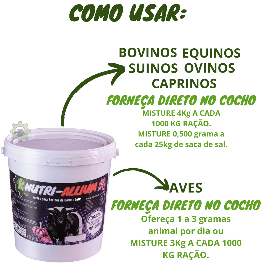 Descrição K-NUTRI-ALLIUM é um Núcleo mineral, vitamínico para mistura, destinado aos Bovinos de Corte e Leite, nas fases cria, recria, engorda e leite, contendo Enxofre e Aroma de Alho. Manter sempre boa disponibilidade. ESPÉCIE E CATEGORIAS DE ANIMAIS A QUE SE DESTINA: Bovinos de Corte: cria, recria e engorda. Bovinos de Leite: cria: vacas secas e em lactação e recria: bezerros(as), novilhas(os) e touros. NÍVEIS DE GARANTIA POR KG DO PRODUTO: Enxofre (mínimo).............................198,0000g/Kg Ferro (mínimo).........................6.000,0000mg/Kg Vitamina A (mínimo)............100.000,0000UI/Kg Vitamina D3 (mínimo)...........50.000,0000UI/Kg Vitamina E (mínimo).......................50,0000UI/Kg Aroma de Alho (mínimo)......2.000,0000mg/Kg B.H.T (mínimo)...........................1.000,5000mg/Kg MODO DE USAR: Misturar 500g do produto em 01(um) saco de 25 Kg de suplemento mineral. Colocar o produto no cocho, de preferência coberto. Misturar 4 Kg do produto em uma tonelada (1.000 Kg) de ração. DEVE SER MISTURADO COM FONTES DE CALCIO, FÓSFORO E OUTROS MACROS MINERAIS E MICROMINERAIS. EM CASO DE DÚVIDAS CONSULTE UM Profissional DE SUA CONFIANÇA. Todos os nossos produtos são registrados e com nota fiscal, garantindo a qualidade e segurança para nossos clientes.