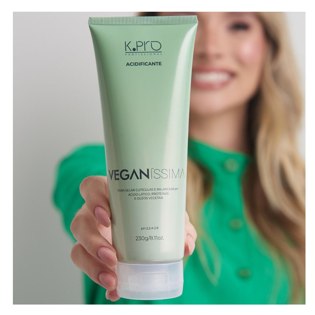 K.pro Acidificante Veganíssima Vegano Selar Cutículas 230g - pH 2.2 A 2.8 Selar Cutículas e Balancear pH Ácido Lático, Proteínas e Óleos Vegetais • SEM PARABENOS • SEM ÓLEO MINERAL • SEM CORANTES • VEGANO #DESCRIÇÃO Veganíssima é a nova linha K.PRO 100% VEGANA, para tratamento cosmético completo e intenso dos cabelos e saúde do couro cabeludo. Essencial para fechar as cutículas e balancear o pH, eliminando gradativamente a aspereza e porosidade dos cabelos. Inclua nas suas hidratações e nutrições em casa ou após descolorações, colorações e tonalizações no salão. Elimina gradativamente a aspereza e porosidade dos cabelos. Resgata a saúde, vitalidade e brilho natural dos fios. #MODO DE USAR MANUTENÇÃO EM CASA: Após lavar o cabelo, aplicar o Veganíssima Acidificante, desembaraçar, deixar agir por 3 minutos, enxaguar e prosseguir com a aplicação da máscara ou condicionador. Usar uma ou duas vezes por semana. #USO PROFISSIONAL Após Colorações / Tonalizantes: Aplicar Veganíssima Acidificante, deixar agir por 5 minutos, enxaguar e prosseguir com a aplicação de máscara ou condicionador (quando necessário o uso de shampoo, aplique-o entre o acidificante e a máscara/condicionador). Após descolorações: Enxaguar o pó descolorante, lavar com Shampoo, aplicar Veganíssima Acidificante dar agir por 5 minutos, enxaguar e prosseguir com o tratamento cosmético ou tonalização. COMPOSIÇÃO EM PORTUGUÊS: Água, Álcool Cetílico, Propanodiol, Metossulfato de Beentrimônio, Pantenol, Álcool Cetoestearílico Ácido CÍtrico, Óleo de Coco, Cloreto de Cetrimônio, Óleo de Soja, Perfume, Quatérnio-87, Fenoxietanol, Álcool Etílico, Amodimeticona Cetomacrogol 1000, Fenil Trimeticona, Cloreto de Hidroxie Beenamidopropil Dimônio, Proteína da Ervilha Hidrolisada, Proteina Vegetal Hidrolisada, Dimeticonol, Hexilenoglicol, Edetato Dissódica Tetra-Di-T-Butil Hidróxi-Hidrocinamato Popilenoglicol, PEG-12 Éter de Álcool Tridecílico, Benzoato de Sódio de Dodecillbenzenosulfonato de Tea, Ácido Lático, Sorbato de Potássio Pentaeritibia Melisotiazolinona, Metilcloroisotiazolinona, Salicilato de Benzila, Butilfenil Metilpropional, D-Limoneno, Linalol. #PRECAUÇÕES Mantes fora do alcance das crianças e animais (Produto não testado em animais)
