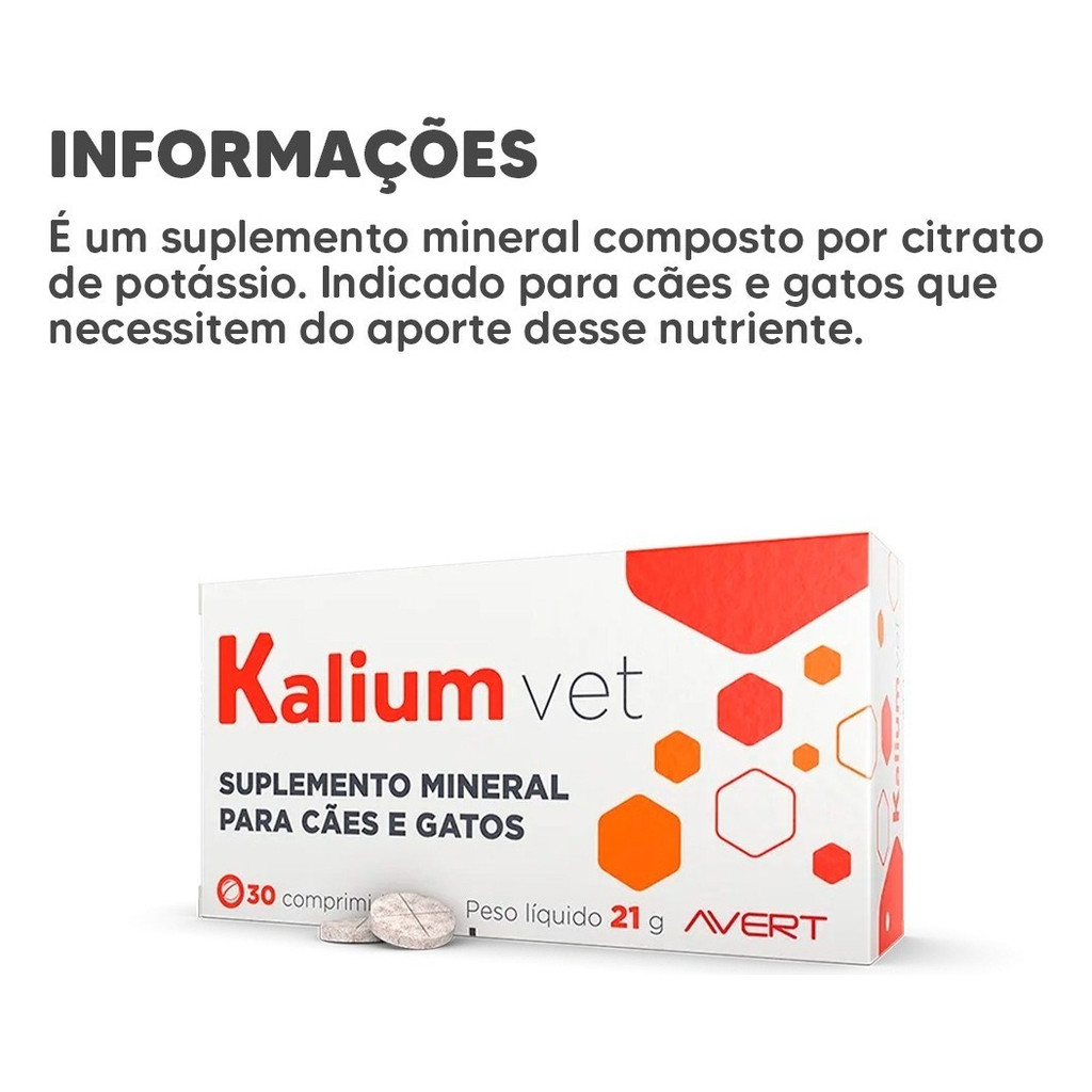 Descrio Kalium Vet 21 g Suplemento para ces e gatos 30 Comprimidos um suplemento mineral para ces e gatos composto por citrato de potssio. INDICAES DE USO Kalium Vet um suplemento mineral composto por citrato de potssio. Indicado para ces e gatos que necessitem do aporte desse nutriente. USO PROIBIDO NA ALIMENTAO DE RUMINANTES COMPOSIO Citrato de Potssio NVEIS DE GARANTIA Por kg Por comprimido Citrato de Potssio 14,3 g 400 mg POSOLOGIA 1 comprimido para 10kg de peso corporal a cada 12 horas ou a critrio do mdico-veterinrio. APRESENTAO Cartucho com 30 comprimidos bissulcados e palatveis. Quem ama cuida: Ns da Novo Pet que prezamos pela sade e bem estar do seu pet, orientamos que, antes de adquirir algum medicamento, consulte um mdico veterinrio de sua confiana.