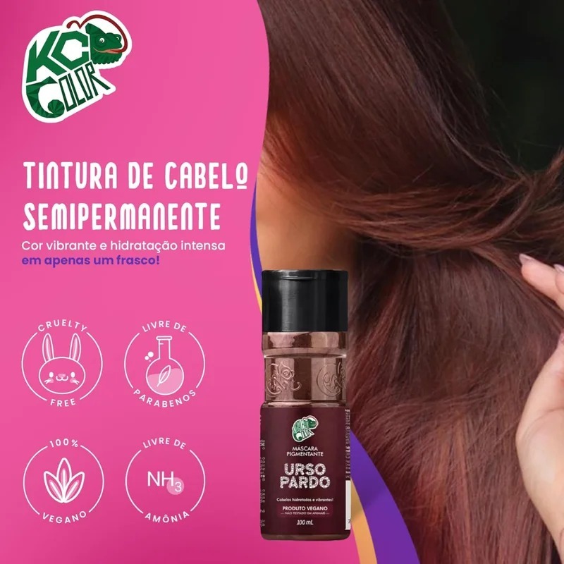 🐻Kamaleão Máscara Pigmentante Urso Pardo 100ml– Castanho Natural Nutritivo A Máscara Pigmentante Kamaleão Color Urso Pardo foi desenvolvida para quem busca um tom castanho chocolate profundo e natural, com acabamento brilhoso e aspecto saudável, sem danificar os fios. Sua fórmula é 100% vegana, sem amônia, sem oxidantes e sem parabenos, permitindo uma coloração suave, tratante e ideal para manutenção da cor, tonalização ou mudança temporária sem agredir a fibra capilar. Com textura cremosa e fácil de aplicar, deposita pigmento enquanto hidrata e nutre, deixando os fios alinhados, macios e com toque sedoso. É perfeita para renovar a cor entre químicas ou para quem não deseja utilizar tintura permanente. ✅ Indicação Cabelos castanhos claros a escuros (realça e aprofunda o tom) Cabelos descoloridos ou claros (resulta em castanho mais fechado e intenso) Pode ser usada em cabelos naturais ou com química Ideal para reavivar o brilho, devolver cor e disfarçar leve desbotamento ✨ Benefícios Tonaliza e intensifica a cor sem danificar Deixa o castanho mais rico, profundo e brilhante Hidratação + nutrição durante o processo Fórmula liberada, vegana e cruelty free Trata enquanto colore Ajuda a reduzir aspecto opaco e ressecado Pode ser usada com frequência 🌸 Ação e Resultados A máscara deposita pigmentos diretos nos fios, entregando cor imediata com toque hidratante e acabamento luminoso. O cabelo fica mais macio, alinhado e com sensação de movimento natural. Quanto mais claro o tom base, mais intensa será a cor final. 🧴 Modo de Uso Lave os cabelos com shampoo e retire o excesso de água. Aplique a máscara uniformemente por todo o comprimento. Deixe agir de 5 a 30 minutos, conforme intensidade desejada. Enxágue bem, sem uso de condicionador. Finalize como preferir. 💡 Dica Extra Para maior durabilidade, evite shampoos muito adstringentes e reduz o uso de água muito quente. Em tons loiros, pode ser usada também como base para escurecer gradualmente sem manchas. 🚫 Não contém Amônia Oxidantes Parabenos Silicones insolúveis Ingredientes de origem animal Original - Envio Rápido com Nota Fiscal.