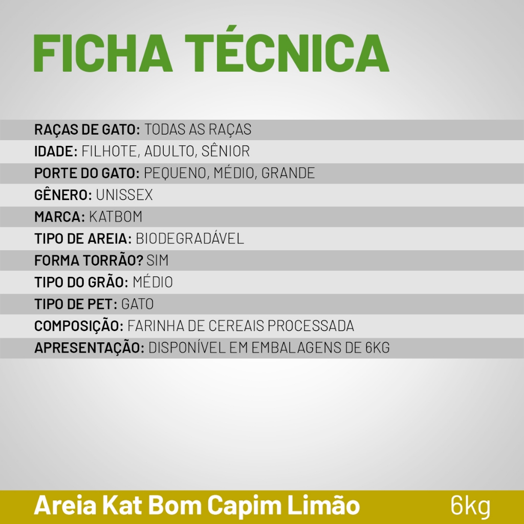 A nossa loja está há mais de 10 anos no mercado, com produtos originais e com nota fiscal. 🐱 AREIA PARA GATO KATBOM NATURAL – GRANULADO HIGIÊNICO COM CAPIM-LIMÃO | 6KG Descrição do produto: A Areia para Gato Katbom Natural proporciona um ambiente limpo, confortável e perfumado para o seu pet. Feita com ingredientes 100% naturais, biodegradáveis e atóxicos, tem alto poder de absorção e forma torrões firmes, facilitando a limpeza diária. Com fragrância suave de capim-limão, hipoalergênica e vegana, neutraliza odores sem causar incômodo ao seu gato. É uma opção sustentável, econômica e prática — e ainda pode ser descartada no vaso sanitário! 🌿 Principais benefícios: - Ingredientes 100% naturais e biodegradáveis - Sem químicos agressivos, feita com farinha de cereais processada - Alta absorção e formação de torrões firmes - Fragrância hipoalergênica de capim-limão, vegana - Menos desperdício e mais rendimento - Embalagem reciclável - Pode ser descartada diretamente no vaso sanitário, sem causar entupimentos 🐾 Indicações de uso: - Para gatos de todas as raças e idades: filhotes, adultos e seniores - Indicada para gatos de pequeno, médio e grande porte ✨ Modo de uso: - Despeje uma camada uniforme de 5 cm na bandeja sanitária - A areia absorve rapidamente a urina, formando torrões firmes - Remova os torrões e fezes a cada 12 horas - Descarte no vaso sanitário, quebrando os maiores se necessário - Complete a bandeja com mais granulado quando necessário - Troque totalmente a areia a cada duas semanas 📦 Dicas de conservação: - Não misture com outros tipos de granulado - Armazene em local seco e arejado, protegido contra umidade e insetos 🌟 A Katbom Natural é ideal para quem valoriza bem-estar, sustentabilidade e praticidade no cuidado com o seu gato. 💬 Gostou? Não perca tempo — garanta já o seu! Se quiser, posso te ajudar a montar uma arte de vitrine digital com esse conteúdo — ou até bolar um post com chamada criativa para engajamento. Só dizer! 🛍️😺✨