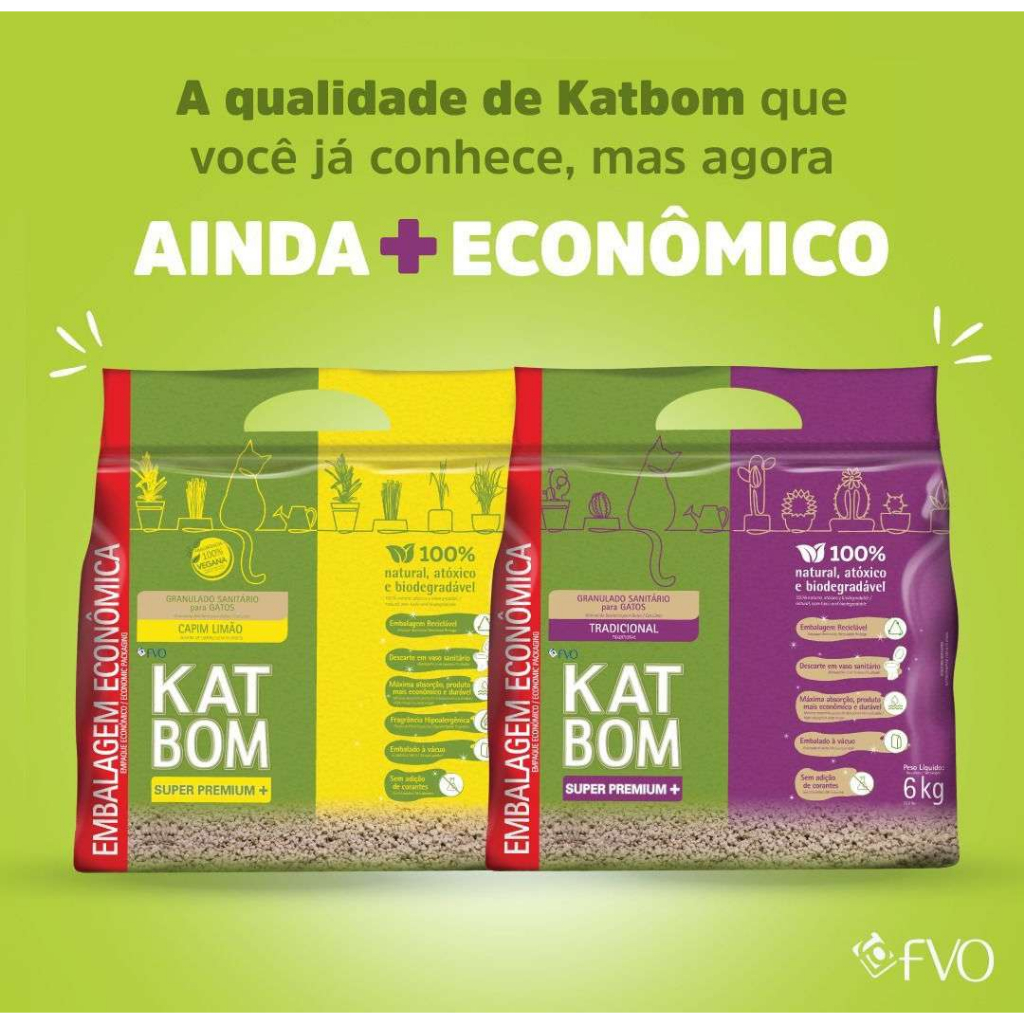 PRODUTO ORIGINAL COM NOTA FISCAL! - - - - - DESCRIÇÃO: KATBOM é o granulado sanitário natural de qualidade superior, especialmente desenvolvido para a higiene dos gatos. Com o granulado KATBOM você elimina vários problemas causados pelas areias higiênicas comuns, onde a urina escorre para o fundo da caixa sanitária, dificultando sua limpeza e permitindo proliferação de bactérias, responsáveis pelos odores desagradáveis. Por ser natural e à base de matéria orgânica, você pode eliminar o granulado KATBOM via vaso sanitário, sem problemas de entupimento de encanamentos ou fossas. - - - - - MODO DE USO: Coloque uma camada de 5 cm do produto em uma bandeja alta. Após a utilização, o granulado sanitário atuará absorvendo a umidade e o odor da urina e das fezes, formando torrões. Com uma pá, retire os torrões. Descarte-os no vaso sanitário ou lixo comum. - - - - - Enviamos o seu pedido o mais rápido possível! Obrigado pela preferência.