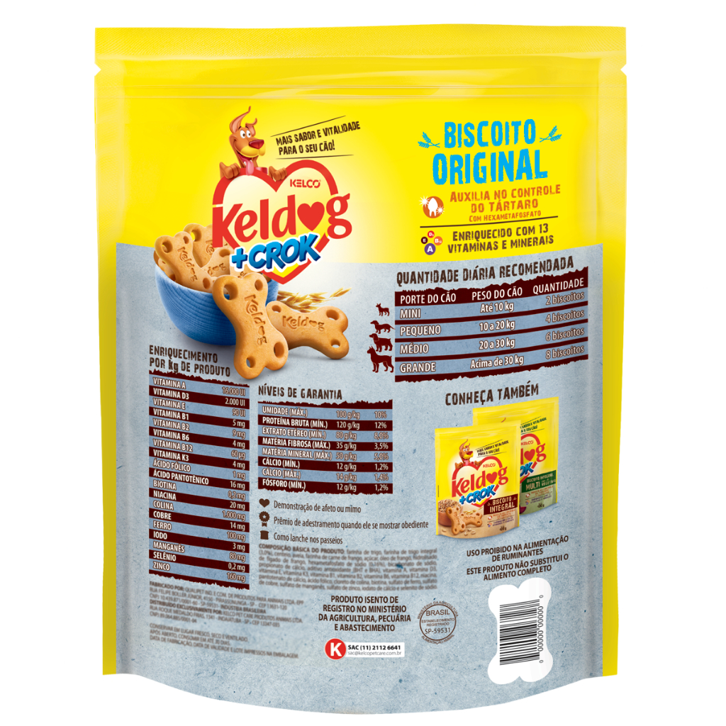 Keldog + Crok Biscoito Original 900g Keldog +Crok Biscoito Original é crocante e delicioso! Perfeito para todos os momentos é o petisco ideal para um lanche nos passeios, demonstração de afeto e prêmio de adestramento. Keldog +Crok Biscoito Original é enriquecido com vitaminas e minerais e possui hexametafosfato que, auxilia no controle do tártaro. MODO DE USO: Cães até 10kg: 2 biscoitos/dia. Cães de 10kg a 20kg: até 4 biscoitos/dia. Cães de 20kg a 30kg: até 6 biscoitos/dia. Cães acima de 30kg: até 8 biscoitos/dia. INDICAÇÕES: Demonstração de afeto ou mimo, prêmio de adestramento quando ele se mostrar obediente, como lanche nos passeios. COMPOSIÇÃO: Farinha de trigo, farinha de carne de frango, açúcar, óleo de frango, hidrolisado de fígado de frango, hexametafosfato de sódio (0,16%), bicarbonato de sódio, propionato de cálcio, aditivo antioxidante (BHT e BHA), vitamina A, vitamina D3, vitamina E, vitamina K3, vitamina B1, vitamina B2, vitamina B6, vitamina B12, niacina, pantotenato de cálcio, ácido fólico, cloreto de colina, biotina, sulfato de ferro, sulfato de cobre, sulfato de manganês, sulfato de zinco, iodato de cálcio e selenito de sódio. NIVEIS DE GARANTIA: - Níveis de garantia: UMIDADE (MÁX) 100g/kg 10% PROTEÍNA BRUTA (MÍN) 120g/kg 12% EXTRATO ETÉREO (MÍN) 80g/kg 8,0% MATÉRIA FIBROSA (MÁX) 25g/kg 2,5% MATÉRIA MINERAL (MÁX) 50g/kg 5,0% CÁLCIO (MÍN) 12g/kg 1,2% CÁLCIO (MÁX) 14g/kg 1,4% FÓSFORO (MÍN) 12g/kg 1,2% - Enriquecimento por kg de produto: VITAMINA A 16.000 UI VITAMINA D3 2.000 UI VITAMINA E 90 UI VITAMINA B1 5mg VITAMINA B2 9mg VITAMINA B6 4mg VITAMINA B12 60 ug VITAMINA K3 4mg ÁCIDO FÓLICO 1mg ÁCIDO PANTOTÊNICO 16mg BIOTINA 0,2mg NIACINA 20mg COLINA 1.000mg COBRE 14mg FERRO 100mg IODO 3mg MANGANÊS 80mg SELÊNIO 0,2mg ZINCO 160mg
