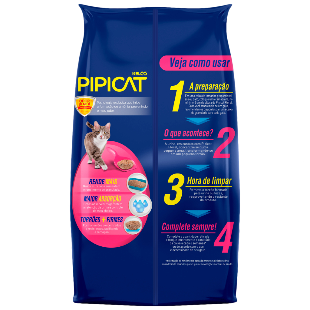 Pipicat Floral Odor Block 4kg Pipicat Floral possui uma suave fragrância floral que, encapsulada no granulado, é liberada apenas quando em contato com a urina, mantendo a bandeja sem odores desagradáveis e sem incomodar o seu animal. Pipicat Floral possui controle de odores superior com a exclusiva tecnologia Pipicat Odor Block, que inibe a formação de amônia, prevenindo o mau odor na bandeja sanitária. Com grãos extrafinos e de boa absorção Pipicat Floral forma torrões mais firmes, que facilitam a limpeza diária. Modo de Uso: 1- A preparação: Em uma caixa de tamanho proporcional ao seu gato, coloque uma camada de, no mínimo, 5 cm de altura de Pipicat Floral. Caso você tenha mais de um gato, recomendamos disponibilizar uma caixa de granulado para cada gato. 2- O que acontece?: A urina, em contato com Pipicat Floral, concentra-se numa pequena área, transformando-se em um pequeno torrão. 3- Hora de limpar: Remova o torrão formado pela urina ou fezes, reaproveitando o restante do produto. 4- Complete sempre!: Complete a quantidade retirada e troque inteiramente o conteúdo da caixa a cada 6 semanas* ou de acordo com o uso e necessidade do seu gato. *Informação de rendimento baseada em testes de laboratório, considerando 1 bandeja para 1 gato em condições normais de saúde. Observção: Não jogar no vaso sanitário. CONSERVAR EM LOCAL FRESCO E SECO. PRODUTO NÃO PERECÍVEL. Composição: Argila esmectita, fragrância e aditivo antiodor.