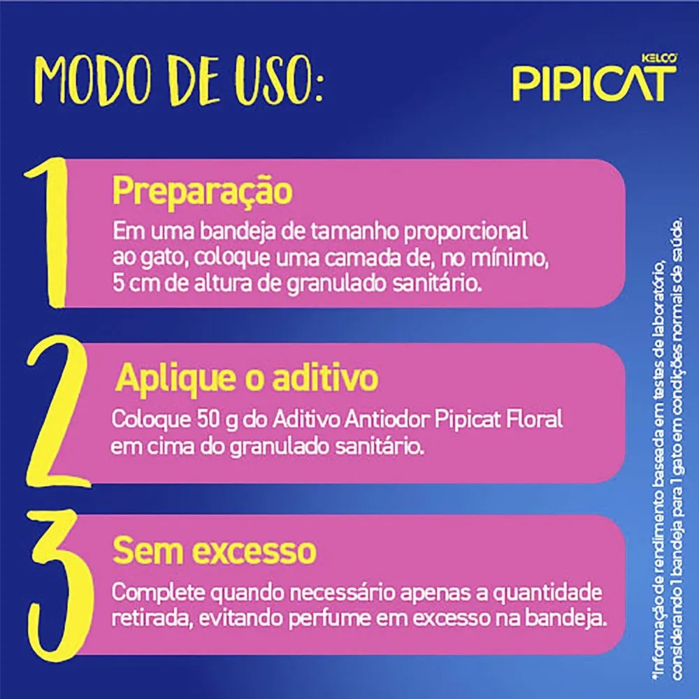 Aditivo Antiodor Pipicat Perfume Floral Suas fórmulas concentradas são responsáveis por aumentar o poder de absorção da areia de seu gato, evitando e inibindo a proliferação de bactérias causadoras do mau cheiro. São fáceis de aplicar, podendo ser usados frequentemente, mantendo a bandeja do gato sempre higienizada. Modo de uso: 1 – Preencha a bandeja com areia sanitária do seu gato, como de costume 2 – Coloque 1 colher de sopa cheia do aditivo em cima da areia sanitária 3 – Complete, quando necessário, apenas a quantidade retirada, evitando perfume em excesso na bandeja. Guia para troca da areia Caso você necessite mudar a areia higiênica do seu gato, o ideal é fazer a transição gradativa. Para isto, comece adicionando uma pequena quantidade da nova areia à antiga, aumentando gradualmente no decorrer dos dias. Assim, o gato não sentirá tanto a mudança, aceitando bem a nova areia sem maiores problemas.