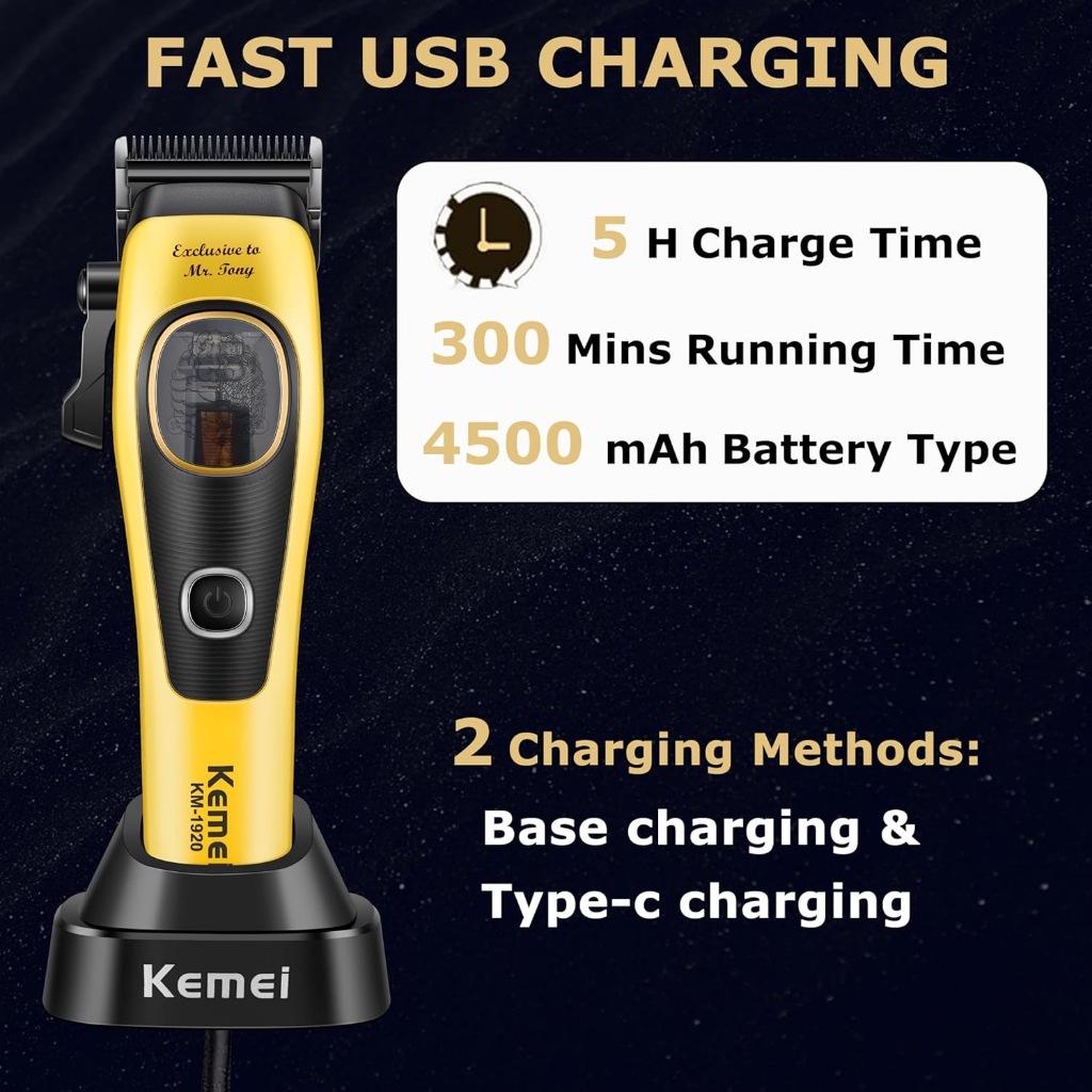 Chinelos Profissionais para Cabelo Para Homens: Este Jogo de Cortador KEMEI 1920 Hair inclui um cortador de cabelo masculino, uma base de carregamento, 2 tampas modulares, 8 pentes limitados de cortador (1,5/3/4,5/6/9/12/16/19 mm) e muito mais. Seja você um barbeiro profissional ou corte de cabelo em casa, este cortador sem fio garantirá um corte suave e liso todas as vezes Necessidades de corte de cabelo perfeitas para todos os homens Bateria de alto desempenho: Os cortadores de cabelo sem fio KM-1920 são equipados com uma bateria recarregável de 4500 mAh de alta capacidade que pode cortar cabelo por até 300 minutos em uma carga de 5 horas, para que você não precise se preocupar com O controle da bateria está acabando de ficar sem bateria no meio de um corte de cabelo, você pode aproveitar sua viagem de corte de cabelo para a mais completa 2 Tampas Modulares Intercambiáveis: O cortador de cabelo KM-1920 vem com duas tampas modulares intercambiáveis, permitindo personalizar a tampa do corpo ao seu gosto. Basta usar a chave de fenda incluída para trocar a capa e, sem esforço, escolher a chave de fenda incluída para trocar a capa e escolher sem esforço o visual preferido. Desfrute de três estilos distintos para mostrar sua flair pessoal Motor de 9000 RPM: Os cortadores de barbeiro KEMEI 1920 são equipados com um motor de suspensão magnético com velocidade de até 9000 RPM, que é poderoso e baixo ruído. O cabelo não só corre sem problemas, mas não vai puxar ou encaixar o cabelo durante o aparar e é menos provável que ele superaqueça e se desgasta sem problemas, mas não vai puxar ou encaixar o cabelo durante o aparar e é menos provável que superaqueça e se desgaste Base de carregamento sem fio: Este aparador de cabelo está pensativamente equipado com uma base de carregamento, diga adeus aos cordões emaranhados e o incômodo de substituir constantemente as baterias, basta colocar o barbeiro na base de carregamento, conecte o cabo de alimentação, Aproveite uma experiência de carregamento rápida e eficiente. Uma vez totalmente carregado, você pode desfrutar de uma experiência de corte de cabelo ininterrupta O óleo não está incluído