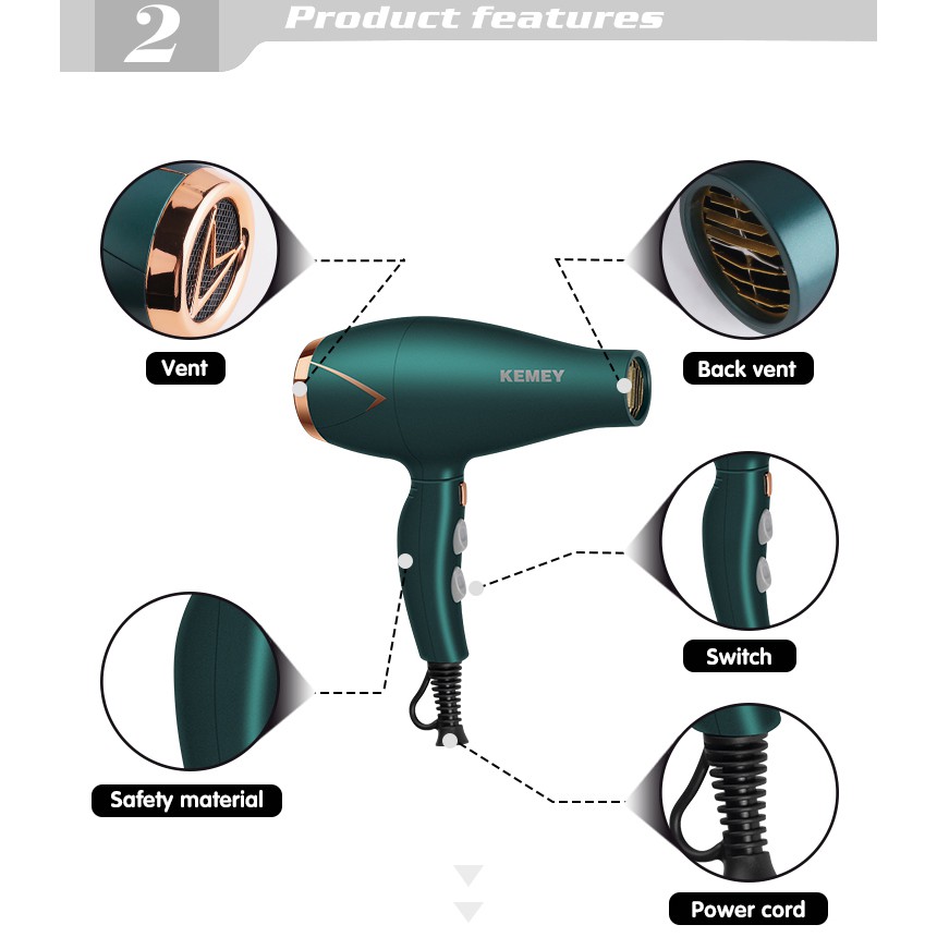 Descrição do produto em inglês após português Economize tempo precioso da manhã ou à noite escolhendo kemei 3500W Secador de Cabelo com 2 configurações de calor e travas de botões frescos estilo em local. deixará seu liso sedoso sedoso, com umidade sem amor. A caixa de presente contém um concentrador, O concentrador é ideal para modelagem de precisão que é reta. Função Turmalina Íon Negativa, que cabelos lisos e mecha na umidade,protegendo contra danos térmicos.Apois para criar cabelos lisos, sedosos e elimina o frizz. Motor DC Profissional, vento ultra forte de 3500W deixe seu cabelo secar dentro de alguns minutos, sem ruído secador de cabelo leve de ruído. Material de alta qualidade e design ergonômico tornando-o mais confortável para segurar, ágil para operar. Marca: kemei, estampa da logo na máquina é cemeia Cor: verde Voltagem: 220-240V 50/60hz Potência: 3500w Conteúdo da embalagem: 1 x máquina 1 x manual 1 x caixa 1 x concentrador ************************************************** Save precious time in the morning or evening by choosing kemei 3500W Hair Dryer with 2 heat settings and cool shot button locks style in place. will leave your hair silky smooth, with no dampness. The gift box contains a concentrator, The concentrator is ideal for precision styling that is straight. Negative Ion Tourmaline function,which smooth hair and lock in moisture,protecting against heat damage.Helps to create smooth, silky hair and eliminates frizz. Professional DC motor, 3500W ultra strong wind let your hair dry within a few minutes,less noise light weight hair dryers. High quality material and ergonomic design make it more comfortable to hold, agile to operate. brand: kemei, the logo print on the machine is kemey color: green voltage: 220-240V 50/60hz Power: 3500w package content: 1 x machine 1 x manual 1 x box 1 x concentrator