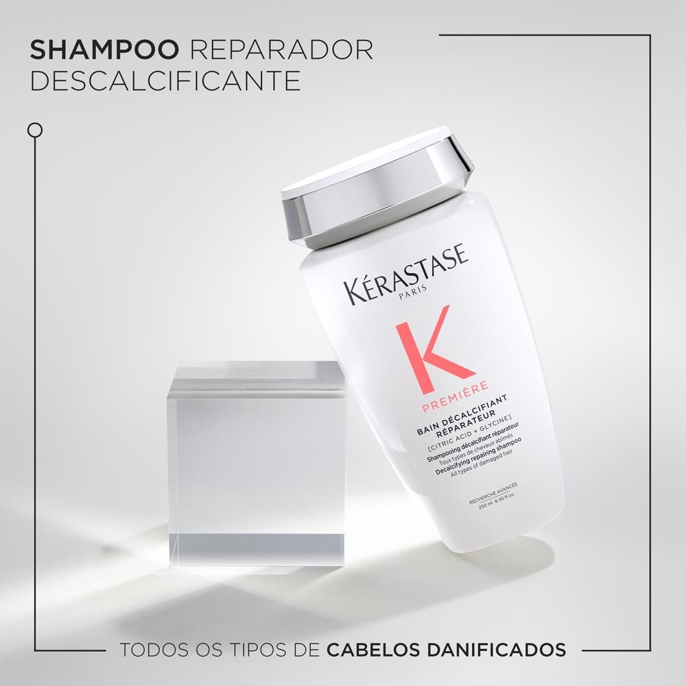 O primeiro tratamento que descalcifica e recria a força original para todos os tipos de cabelos danificados. A água corrente possui cálcio, danificando ainda mais os cabelos superprocessados ou danificados. A cada contato com a água, o cálcio se acumula criando danos recorrentes. Por serem mais porosos, os cabelos danificados absorvem 3 vezes mais cálcio que os cabelos saudáveis. A concentração de ácidos puros deste tratamento tem uma dupla ação: descalcifica o cabelo deste excesso de cálcio e repara-o de dentro para fora, restaurando a força do cabelo e revertendo o seu aspecto rígido e opaco. Com a sua textura de gel transparente, este brilhante tratamento capilar reduz drasticamente os danos persistentes, reparando as ligações rompidas entre as cadeias de queratina para recriar a força e reforçar a estrutura do cabelo. * RESULTADO: Reparação * SUGESTÕES DE USO: 1.Aplique sobre os cabelos molhados, em camadas, por cima do CONCENTRÉ DÉCALCIFIANT ULTRA-RÉPARATEUR. 2.Massageie e emulsifique. 3.Enxágue bem. 4.Acompanhe com Première Fondant Fluidité Réparateur ou Máscara Filler Réparateur. * ITENS INCLUSOS: 1 Kérastase Bain Décalcifiant Réparateur Première Shampoo 250ml