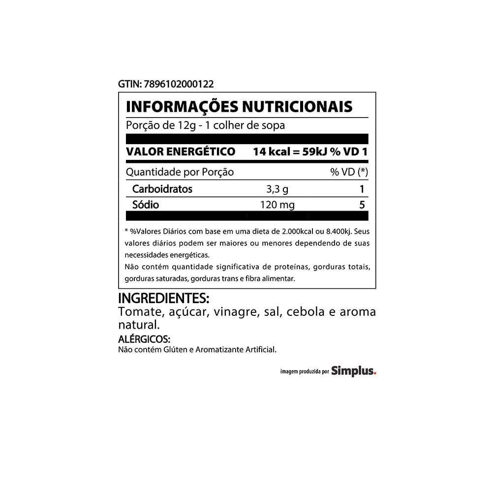 Características do Produto: Marca: Heinz Informações Gerais: Ingredientes : Tomate, açúcar, vinagre, sal, cebola e aroma natural Recomendações e Orientações : Agite antes de usar Armazenagem (Local): Fresco;Seco;Temperatura Ambiente Validade: 12 Mêses Validade após Aberto: 2 Mêses Fornecedor: HEINZ BRASIL S/A